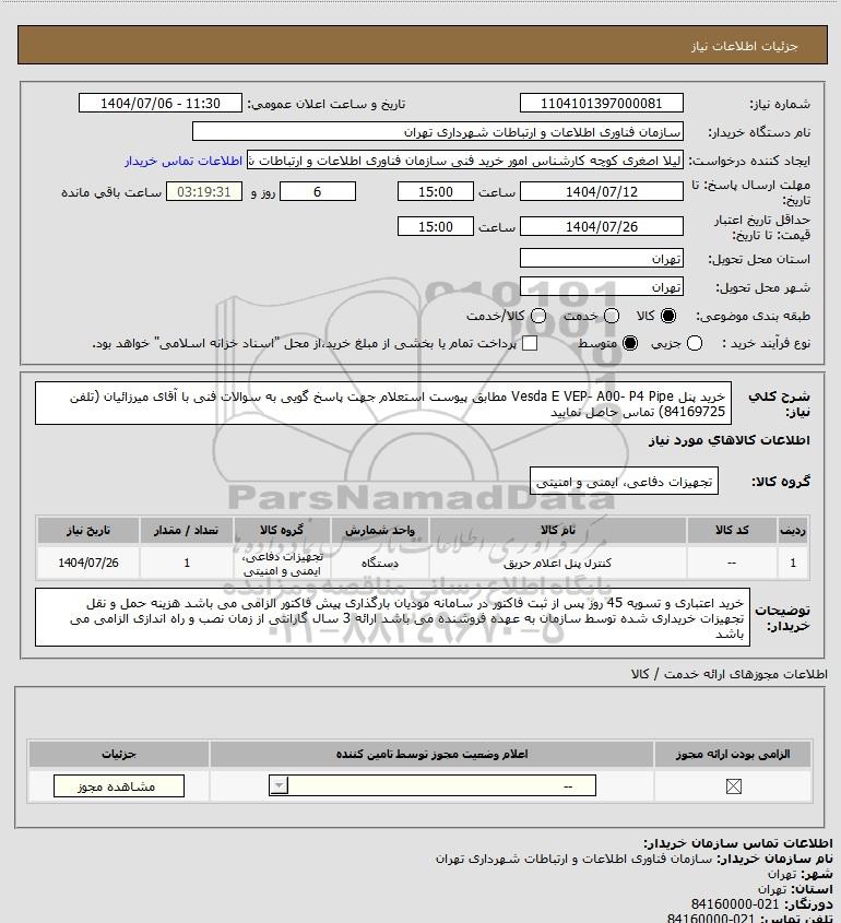 | 1 | -- | کنترل پنل اعلام حریق | دستگاه | تجهیزات دفاعی، ایمنی و امنیتی | 1 | 1404/07/26 |