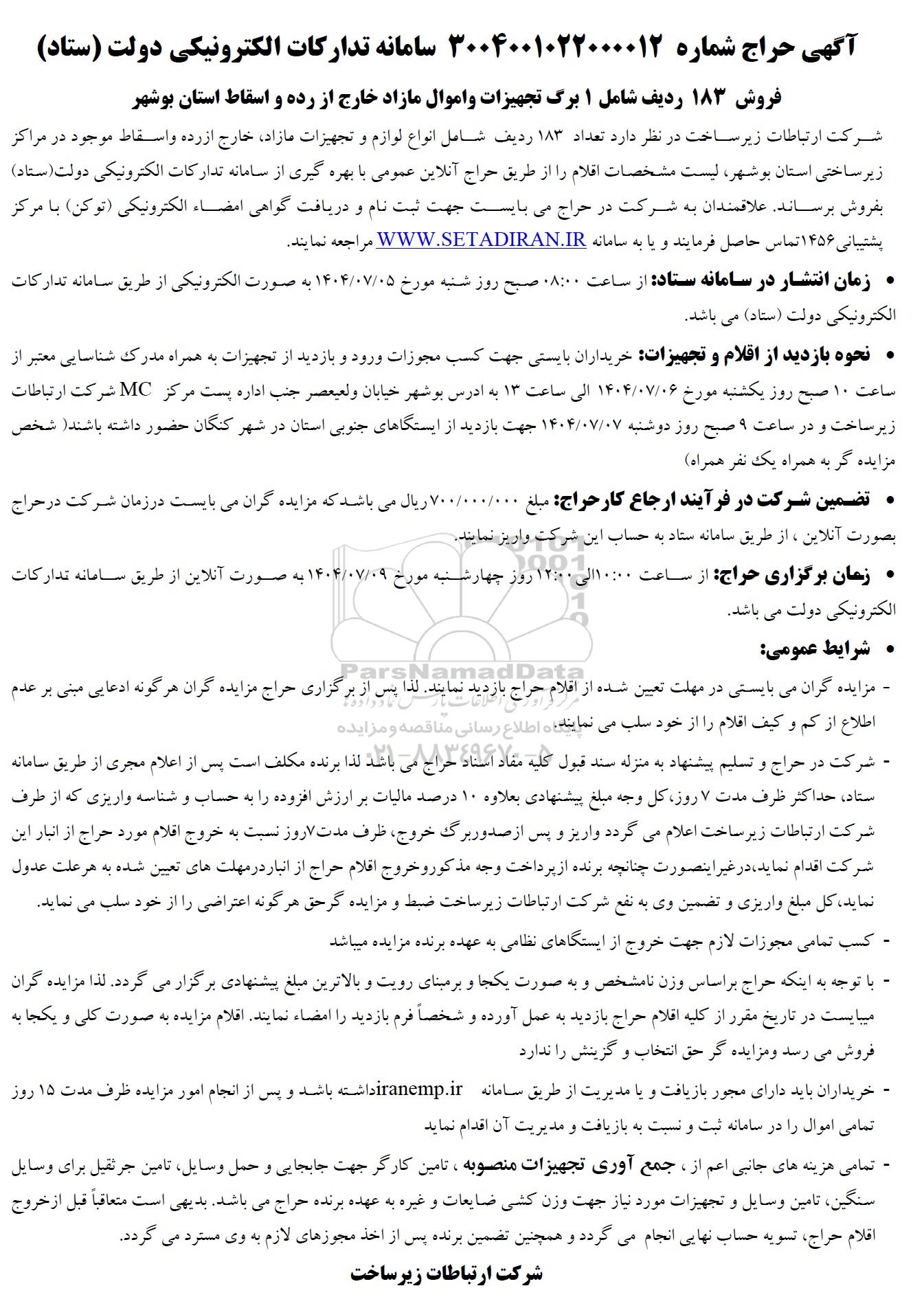 شرکت ارتباطات زیر ساخت در نظر دارد تعداد 183 ردیف شامل انواع لوازم و تجهیزات مازاد خارج از رده و اسقاط موجود در مراکز زیر ساختی استان بوشهر لیست مشخصات اقلام را از طریق حراج آنلاین عمومی با بهره گیری از سامانه تدارکات الکترونیکی دولت (ستاد) بفروش برساند. علاقمندان به شرکت در حراج می بایست جهت ثبت نام و دریافت گواهی امضاء الکترونیکی (توکن) با مرکز پشتیبانی ۱۴۵۶ تماس حاصل فرمایند و یا به سامانه ستاد ایران مراجعه نمایند.