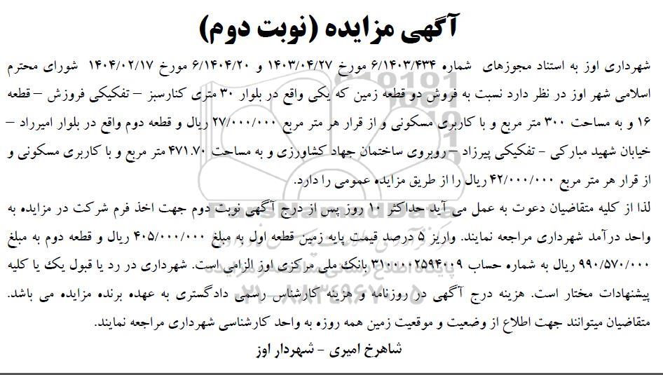 شهرداری اوز به استناد مجوزهای شماره 6.1403.434 مورخ 1403.04.27 و 6.1404.20 مورخ 1404.02.17 شورای محترم اسلامی شهر اوز در نظر دارد نسبت به فروش دو قطعه زمین که یکی واقع در بلوار 30 متری کنار سبز - تفکیکی فروزش – قطعه 16 و به مساحت 300 متر مربع و با کاربری مسکونی و از قرار هر متر مربع 27.000.000 ریال و قطعه دوم واقع در بلوار امیر راد - خیابان شهید مبارکی - تفکیکی پیرزاد - روبروی ساختمان جهاد کشاورزی و به مساحت 471.70 متر مربع و با کاربری مسکونی و از قرار هر متر مربع 42.000.000 ریال را از طریق مزایده عمومی را دارد.