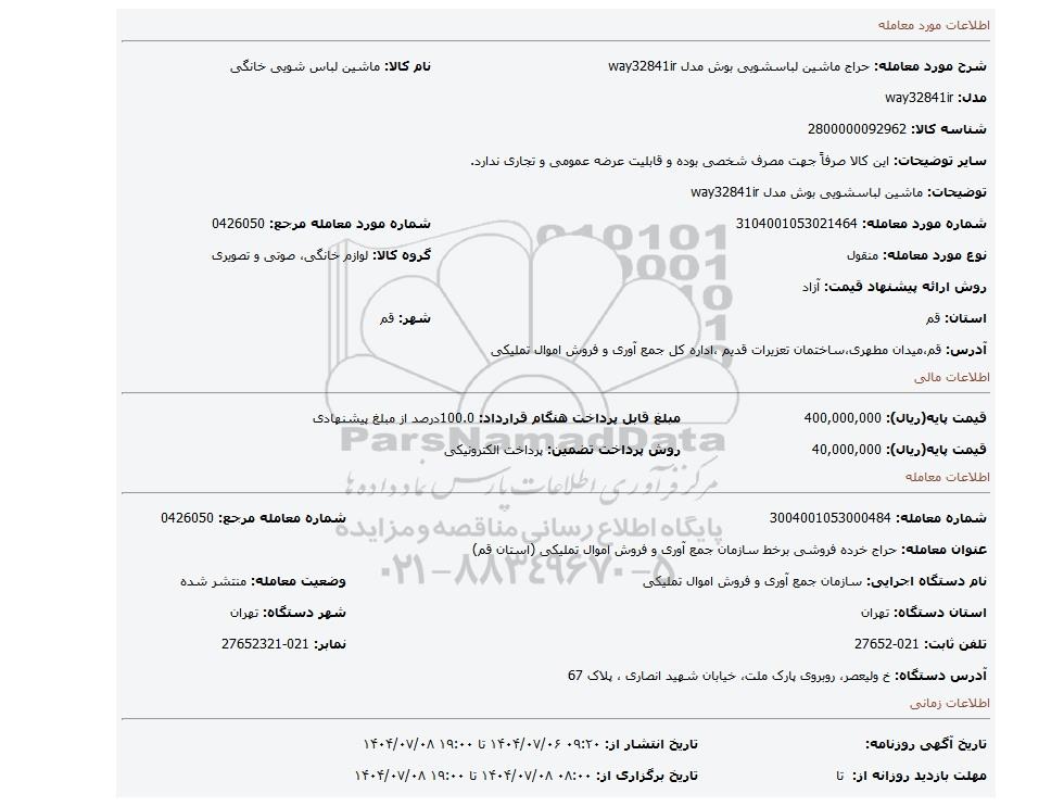 | شماره مورد معامله: 3104001053021464 | شماره مورد معامله مرجع: 0426050 | |