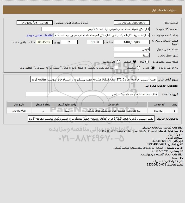 شرح کلی نیاز: نصب اسپیس فرم به ابعاد 2.5*3 ایران کدکالا مشابه جهت پیشگیری از اشتباه فایل پیوست مطالعه گردد