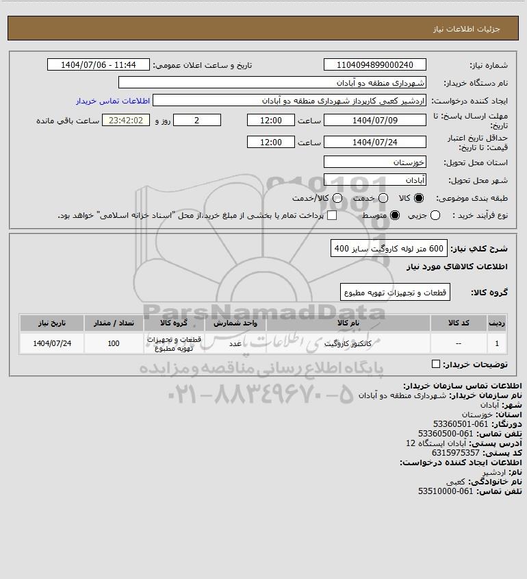 شرح کلی نیاز: 600 متر لوله کاروگیت سایز 400