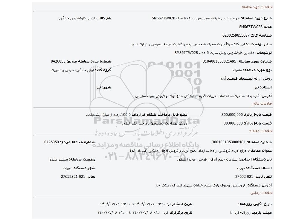 مزایده عمومی مزایده ماشین ظرفشویی بوش سری 6 مدل SMS67TW02B برگزار میگردد. از کلیه افراد متخصص و شرکت‌های واجد شرایط دعوت به عمل می‌آید تا در این مزایده با کد خبرگزاری پارس نماد : 9611354 شرکت نمایند تاریخ شروع مزایده : 1404/07/06 مهلت شرکت در مزایده: تا پایان روز 1404/07/08 مکان برگزاری اموال واگذاری استان‌های قم و دسته‌بندی‌های مربوط به این حراجی متفرقه میباشد.