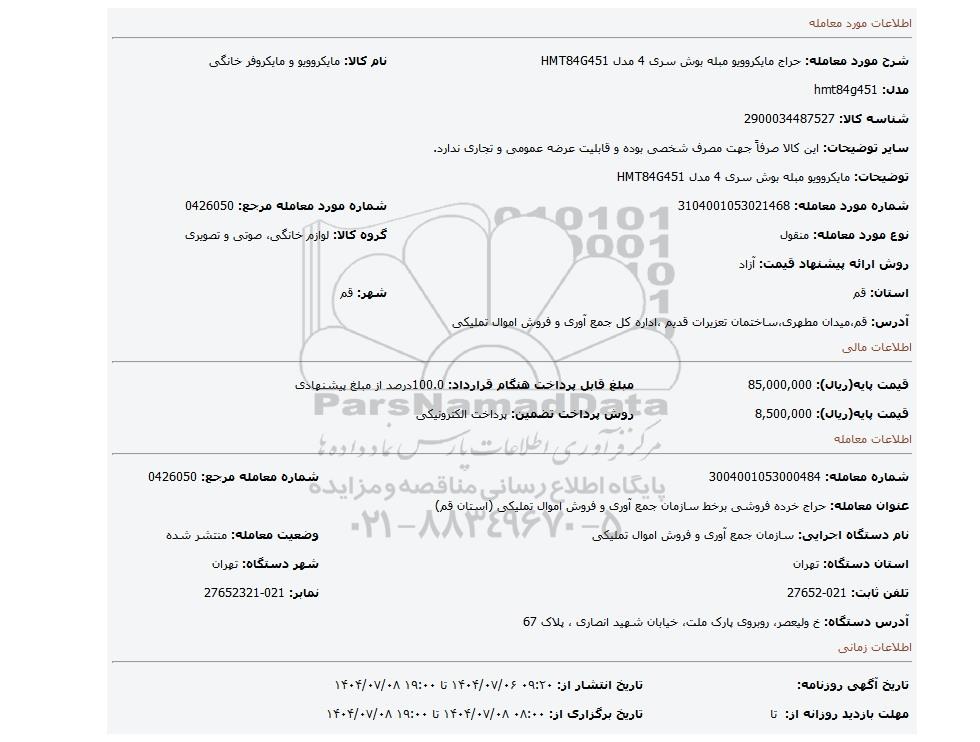 مزایده عمومی مزایده مایکروویو مبله بوش سری 4 مدل HMT84G451 برگزار میگردد. از کلیه افراد متخصص و شرکت‌های واجد شرایط دعوت به عمل می‌آید تا در این مزایده با کد خبرگزاری پارس نماد : 9611376 شرکت نمایند تاریخ شروع مزایده : 1404/07/06 مهلت شرکت در مزایده: تا پایان روز 1404/07/08 مکان برگزاری اموال واگذاری استان‌های قم و دسته‌بندی‌های مربوط به این حراجی متفرقه میباشد.