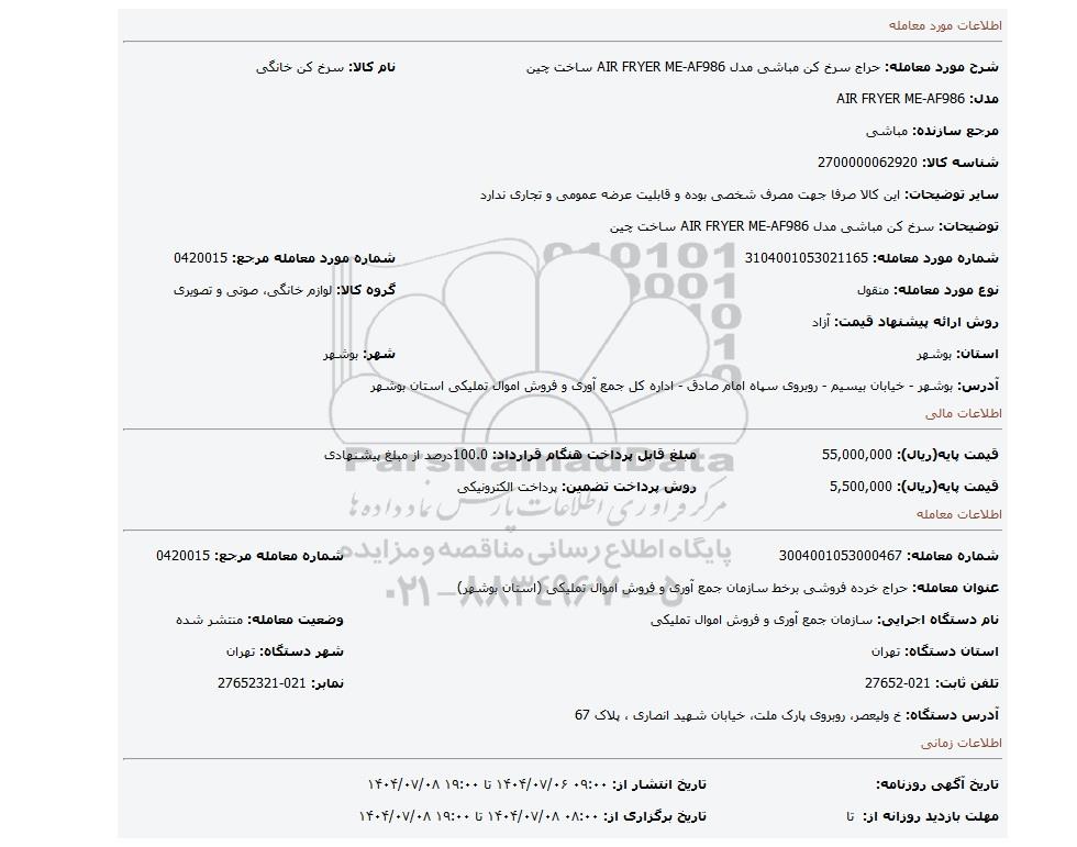 | شماره مورد معامله: 3104001053021165 | شماره مورد معامله مرجع: 0420015 | |