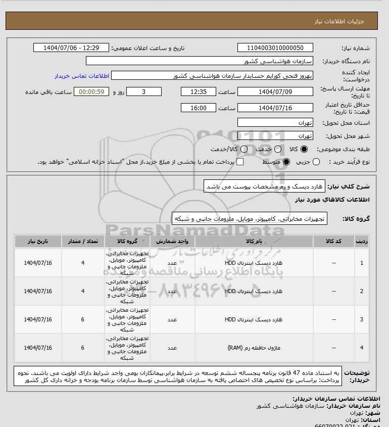 | 3 | -- | هارد دیسک اینترنال HDD | عدد | تجهیزات مخابراتی، کامپیوتر، موبایل، ملزومات جانبی و شبکه | 6 | 1404/07/16 |