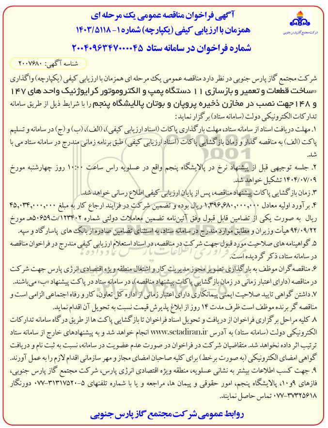 شرکت مجتمع گاز پارس جنوبی در نظر دارد مناقصه عمومی یک مرحله ای همزمان با ارزیابی کیفی (یکپارچه) واگذاری ساخت قطعات و تعمیر و بازسازی 11 دستگاه پمپ و الکتروموتور کرایوژنیک واحدهای 147 و 148 جهت نصب در مخازن ذخیره پروپان و بوتان پالایشگاه پنجم را با شرایط ذیل از طریق سامانه تدارکات الکترونیکی دولت (سامانه ستاد) برگزار نماید :