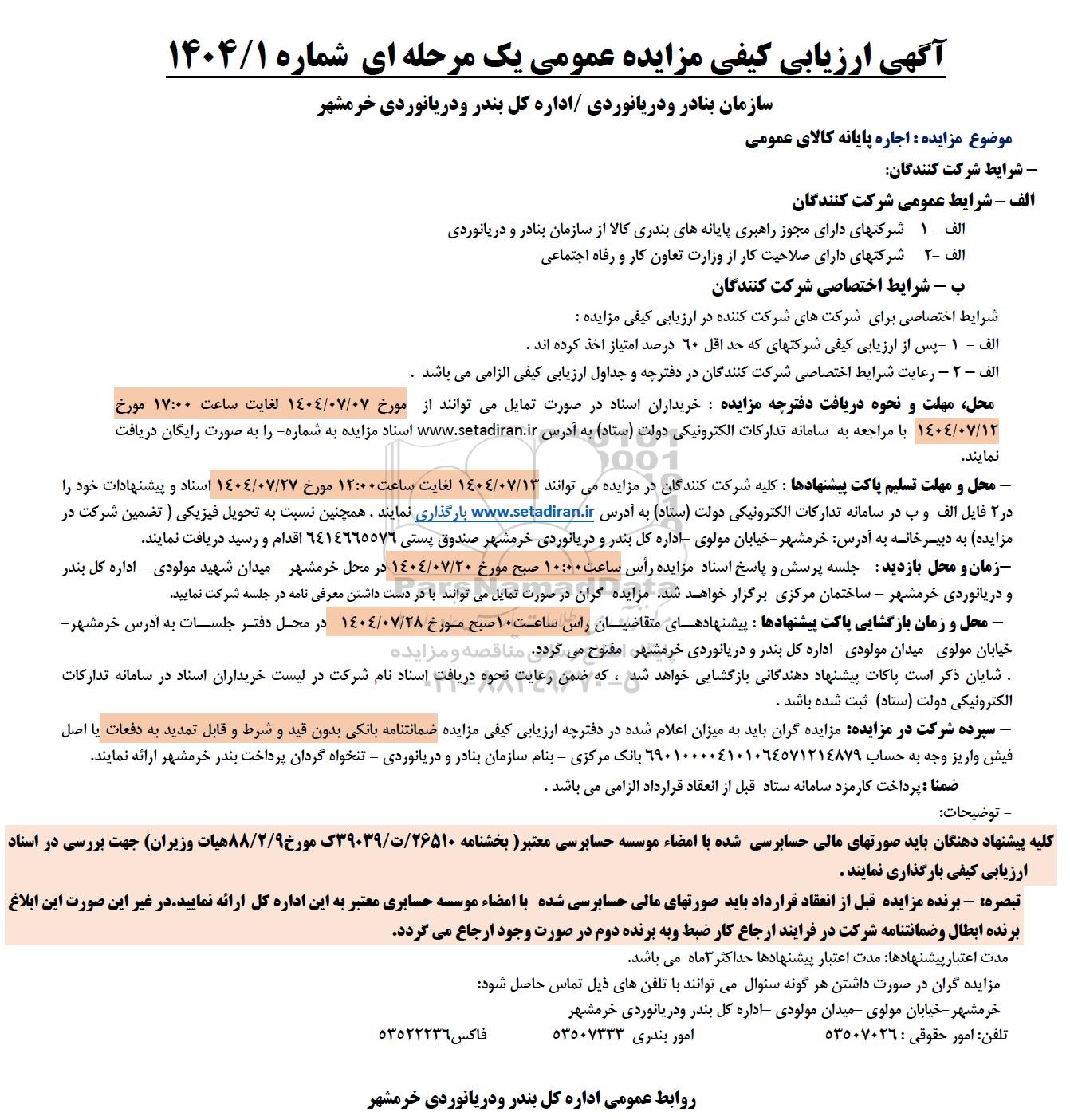آگهی ارزیابی کیفی مزایده عمومی یک مرحله ای شماره 1404/1
