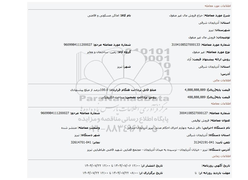 | شماره مورد معامله: 3104108527000133 | شماره مورد معامله مرجع: 9609984111200027 | |