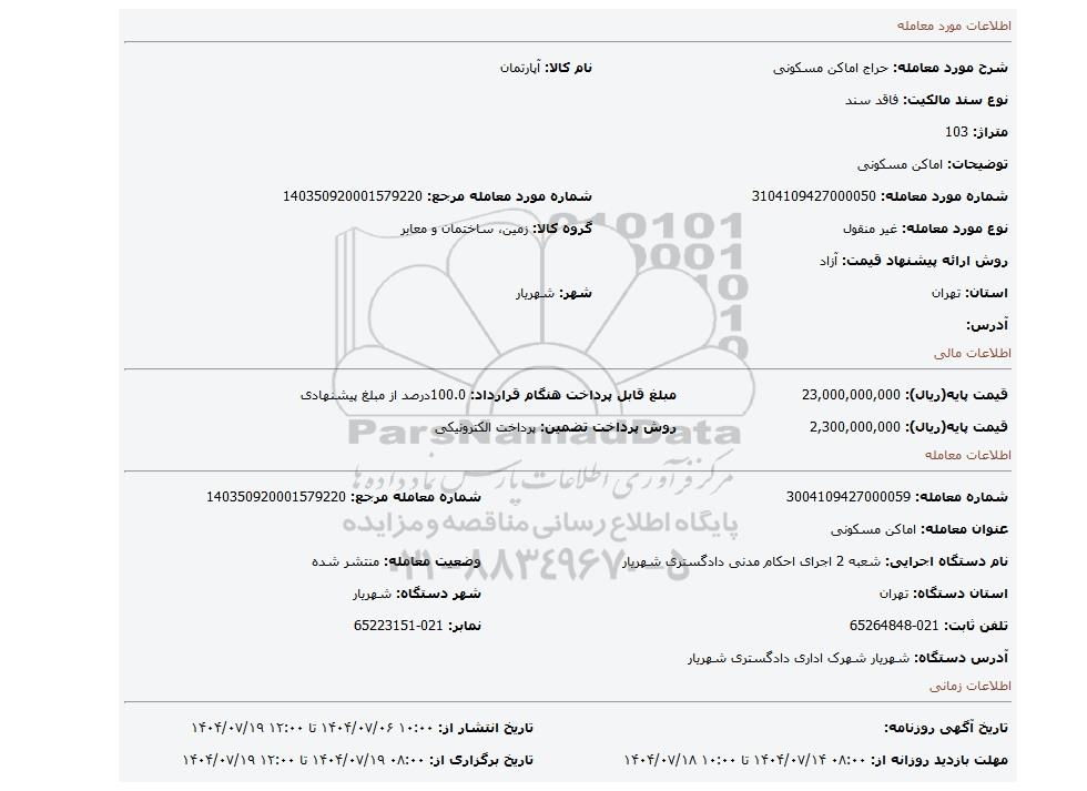شرح مورد معامله: حراج اماکن مسکونینام کالا: آپارتمان