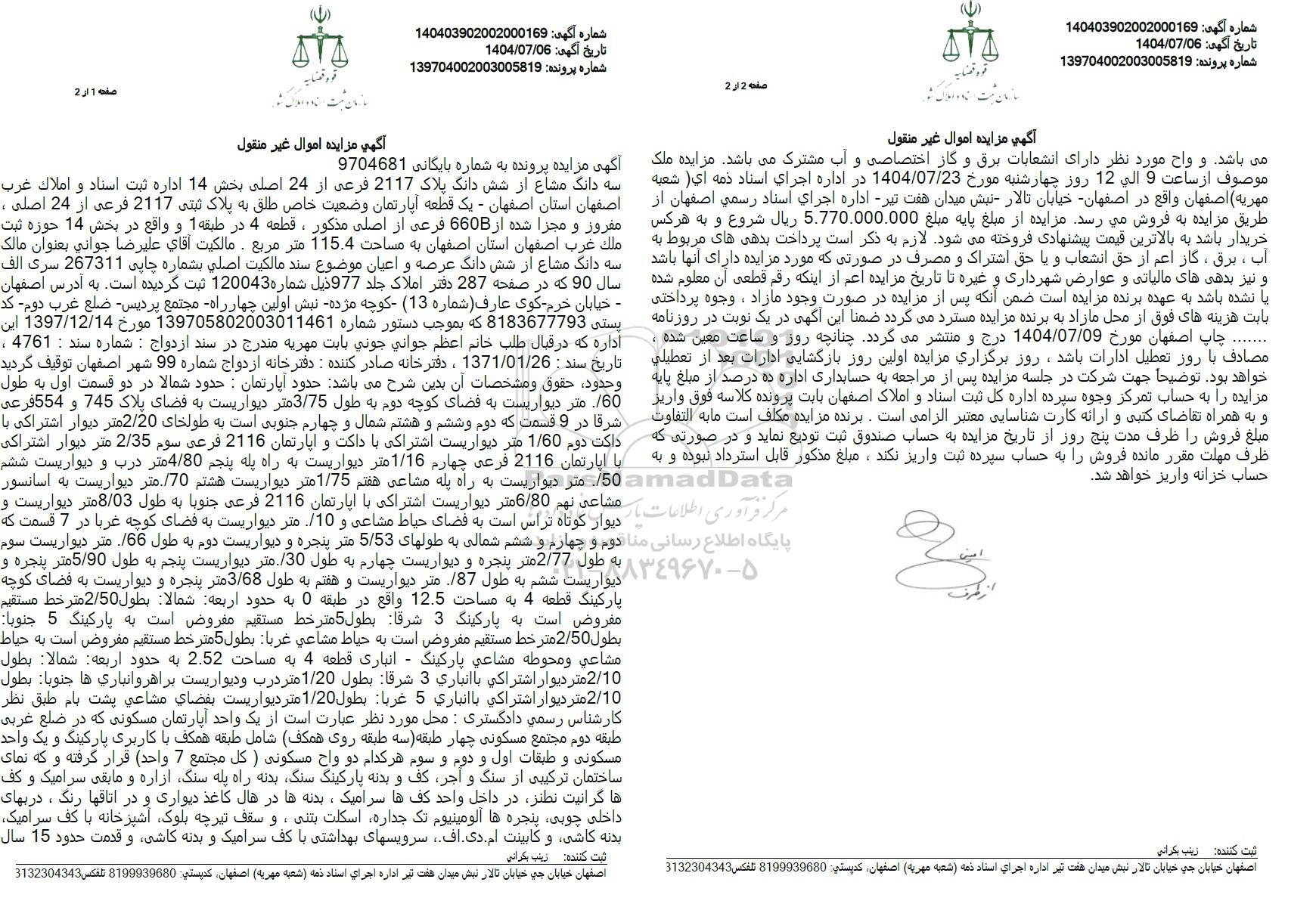 سه دانگ مشاع از شش دانگ پلاک 2117 فرعی از 24 اصلی بخش 14 اداره ثبت اسناد و املاک غرب اصفهان استان اصفهان - یک قطعه آپارتمان وضعیت خاص طلق به پلاک ثبتی 2117 فرعی از 24 اصلی . مغرور و مجزا شده از 660B فرعی از اصلی مذکور ، قطعه 4 در طبقه 1 و واقع در بخش 14 حوزه ثبت ملك غرب اصفهان استان اصفهان به مساحت 115.4 متر مربع - مالكیت آقای علیرضا جوانی بعنوان مالک سه دانگ مشاع از شش دانگ عرصه و اعیان موضوع سند مالکیت اصلی بشماره چایی 267311 سری الف سال 90 که در صفحه 287 دفتر املاک جلد 977 ذیل شماره 120043 ثبت گردیده است. به آدرس اصفهان - خیابان خرم کوی عارف شماره (13) کوچه مژده نبش اولین چهار راه مجتمع پردیس - ضلع غرب دوم کد پستی 8183677793 که بموجب دستور شماره 139705802003011461 مورخ 1397.12.14 این اداره که در قبال طلب خانم اعظم جوانی جونی بابت مهریه مندرج در سند ازدواج : شماره سند : 4761 ، ، دفترخانه صادر کننده : دفترخانه ازدواج شماره 99 شهر اصفهان توقیف گردید وحدود حقوق و مشخصات آن بدین شرح میباشد حدود آپارتمان : حدود شمالا در دو قسمت اول به طول 60 متر دیواریست به فضای کوچه دوم به طول 3.75 متر دیواریست به فضای پلاک 745 و 554 فرعی 1371.01.26 : تاریخ سند شرقا در 9 قسمت که دوم و ششم و هشتم شمال و چهارم جنوبی است به طولخای 2.20 متر دیوار اشتراکی با داکت دوم 1.60 متر دیواریست اشتراکی با داکت و آپارتمان 2116 فرعی سوم 2.35 متر دیوار اشتراکی با اپارتمان 2116 فرعی چهارم 1.16 متر دیواریست به راه پله پنجم 4.80 متر درب و دیواریست ششم 50 متر دیواریست به راه پله مشاعی هفتم 1.75 متر دیواریست هشتم 70 متر دیواریست به اسانسور مشاعی نهم 6.80 متر دیواریست اشتراکی با آپارتمان 2116 فرعی جنوبا به طول 8.03 متر دیواریست و دیوار کوتاه تر اس است به فضای حیاط مشاعی و 10 متر دیواریست به فضای کوچه غربا در 7 قسمت که دوم و چهارم و ششم شمالی به طولهای 5.53 متر پنجره و دیواریست دوم به طول 66 متر دیواریست سوم به طول 2.77 متر پنجره و دیواریست چهارم به طول 30 متر دیواریست پنجم به طول 5.90 متر پنجره و دیواریست ششم به طول 187 متر دیواریست و هفتم به طول 3.68 متر پنجره و دیواریست به فضای کوچه پارکینگ قطعه 4 به مساحت 12.5 واقع در طبقه 0 به حدود اربعه شمالا بطول 2.50 متر خط مستقیم مفروض است به پارکینگ 3 شرقا بطول 5 متر خط مستقیم مفروض است به پارکینگ 5 جنوبا بطول 2.50 متر خط مستقیم مفروض است به حیاط مشاعی غربا بطول 5 متر خط مستقیم مقروض است به حیاط مشاعی ومحوطه مشاعی پارکینگ - انباری قطعه 4 به مساحت 2.52 به حدود اربعه شمالا یطول 2.10 متر دیوار اشتراكی با انباری 3 شرقا بطول 1.20 متر درب و دیواریست براهرو انباری ها جنوبا یطول 2.10 متر دیوار اشتراكی با انباری 5 غربا بطول 1.20 متر دیواریست بفضای مشاعی پشت بام طبق نظر کارشناس رسمی دادگستری : محل مورد نظر عبارت است از یک واحد آپارتمان مسکونی که در ضلع غربی طبقه دوم مجتمع مسکونی چهار طبقه سه طبقه روی همکف شامل طبقه همکف با کاربری پارکینگ و یک واحد مسکونی و طبقات اول و دوم و سوم هر کدام دو واح مسکونی ) كل مجتمع 7 واحد قرار گرفته و که نمای ساختمان ترکیبی از سنگ و آجر کف و بدنه پارکینگ سنگ بدنه راه پله سنگ ازاره و مابقی سرامیک و کف ها گرانیت نطنز در داخل واحد کفها سرامیک ، بدنه ها در هال کاغذ دیواری و در اتاقها رنگ ، در بهای داخلی چوبی پنجره ها آلومینیوم تک جداره اسکلت بتنی ، و سقف تیرچه بلوک آشپز خانه با کف سرامیک بدنه کاشی و کابینت ام. دی. اف. سرویسهای بهداشتی با کف سرامیک و بدنه کاشی و قدمت حدود 15 سال می باشد و واح مورد نظر دارای انشعابات برق و گاز اختصاصی و آب مشترک می باشد. مزایده ملک موصوف از ساعت 9 الی 12 روز چهارشنبه مورخ 1404.07.23 در اداره اجرای اسناد ذمه ای شعبه مهریه اصفهان واقع در اصفهان خیابان تالار نبش میدان هفت تیر - اداره اجرای اسناد رسمی اصفهان از طریق مزایده به فروش میرسد. مزایده از مبلغ پایه مبلغ 5.770.000.000 ریال شروع و به هرکس خریدار باشد به بالاترین قیمت پیشنهادی فروخته میشود. لازم به ذکر است پرداخت بدهی های مربوط به آب ، برق ، گاز ا