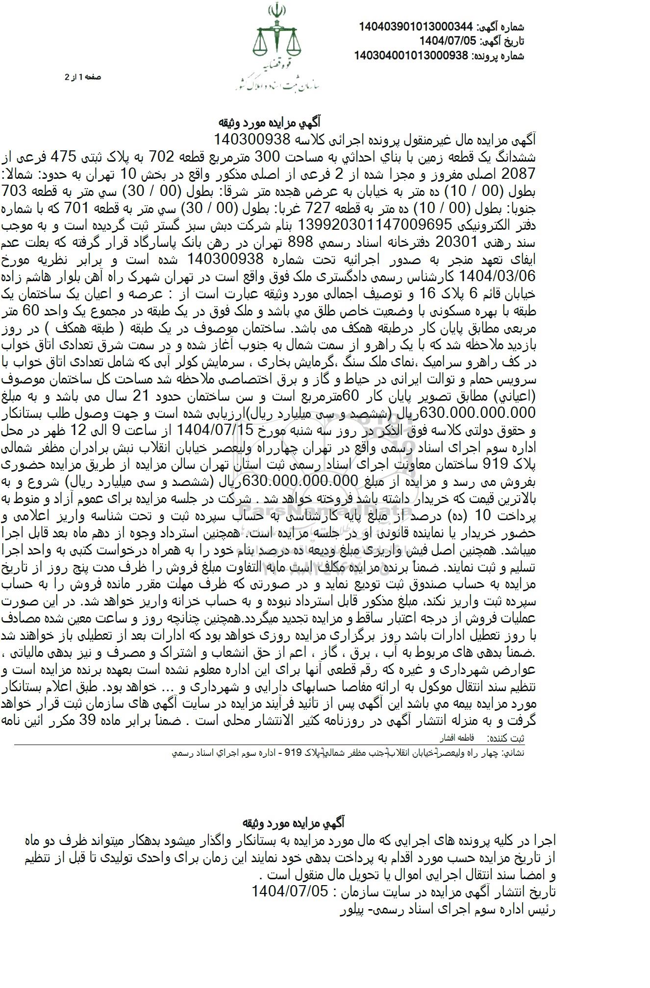 ششدانگ یک قطعه زمین با بنای احداثی به مساحت 300 متر مربع قطعه 702 به پلاک ثبتی 475 فرعی از 2087 اصلی مفروز و مجزا شده از 2 فرعی از اصلی مذکور واقع در بخش 10 تهران به حدود شمالا بطول (00 . 10) ده متر به خیابان به عرض هجده متر شرقا يطول (00 . 30) سي متر به قطعه 703 جنوبا : بطول (00 . 10) ده متر به قطعه 727 غربا : بطول 00 . 30) سي متر به قطعه 701 که با شماره دفتر الکترونیکی 139920301147009695 بنام شرکت دبش سبز گستر ثبت گردیده است و به موجب سند رهنی 20301 دفترخانه اسناد رسمی 898 تهران در رهن بانک پاسارگاد قرار گرفته که بعلت عدم ایفای تعهد منجر به صدور اجرائیه تحت شماره 140300938 شده است و برابر نظریه مورخ 1404.03.06 کارشناس رسمی دادگستری ملک فوق واقع است در تهران شهرک راه آهن بلوار هاشم زاده خیابان قائم 6 پلاک 16 و توصیف اجمالی مورد وثیقه عبارت است از: عرصه و اعیان یک ساختمان یک طبقه با بهره مسکونی با وضعیت خاص طلق میباشد و ملک فوق در یک طبقه در مجموع یک واحد 60 متر مربعی مطابق پایان کار در طبقه همکف میباشد ساختمان موصوف در یک طبقه ) طبقه همکف ) در روز بازدید ملاحظه شد که با یک راهرو از سمت شمال به جنوب آغاز شده و در سمت شرق تعدادی اتاق خواب در کف راهرو سرامیک نمای ملک سنگ گرمایش بخاری، سرمایش کولر آبی که شامل تعدادی اتاق خواب با سرویس حمام و توالت ایرانی در حیاط و گاز و برق اختصاصی ملاحظه شد مساحت کل ساختمان موصوف اعياني) مطابق تصویر پایان کار 60 متر مربع است و سن ساختمان حدود 21 سال می باشد و به مبلغ 630.000.000.000 ریال ششصد و سی میلیارد ریال ارزیابی شده است و جهت وصول طلب بستانکار و حقوق دولتی کلاسه فوق الذکر در روز سه شنبه مورخ 1404.07.15 از ساعت 9 الی 12 ظهر در محل اداره سوم اجرای اسناد رسمی واقع در تهران چهارراه ولیعصر خیابان انقلاب نبش برادران مظفر شمالی پلاک 919 ساختمان معاونت اجرای اسناد رسمی ثبت استان تهران سالن مزایده از طریق مزایده حضوری بفروش می رسد و مزایده از مبلغ 630.000.000.000 ريال ششصد و سی میلیارد ریال شروع و به بالاترین قیمت که خریدار داشته باشد فروخته خواهد شد. شرکت در جلسه مزایده برای عموم آزاد و منوط به پرداخت 10 (ده) درصد از مبلغ پایه کارشناسی به حساب سپرده ثبت و تحت شناسه واریز اعلامی و حضور خریدار با نماینده قانونی او در جلسه مزایده است. همچنین استرداد وجوه از دهم ماه بعد قابل اجرا میباشد. همچنین اصل فیش واریزی مبلغ ودیعه ده درصد بنام خود را به همراه درخواست کتبی به واحد اجرا تسلیم و ثبت نمایند ضمنا برنده مزایده مکلف است ما به التفاوت مبلغ فروش را ظرف مدت پنج روز از تاریخ مزایده به حساب صندوق ثبت تودیع نماید و در صورتی که ظرف مهلت مقرر مانده فروش را به حساب سپرده ثبت واریز نکند مبلغ مذکور قابل استرداد نبوده و به حساب خزانه واریز خواهد شد. در این صورت عملیات فروش از درجه اعتبار ساقط و مزایده تجدید میگردد. همچنین چنانچه روز و ساعت معین شده مصادف با روز تعطیل ادارات باشد روز برگزاری مزایده روزی خواهد بود که ادارات بعد از تعطیلی باز خواهند شد ضمنا بدهیهای مربوط به آب ، برق ، گاز ، اعم از حق انشعاب و اشتراک و مصرف و نیز بدهی مالیاتی ، عوارض شهرداری و غیره که رقم قطعی آنها برای این اداره معلوم نشده است بعهده برنده مزایده است و تنظیم سند انتقال موکول به ارائه مفاصا حسابهای دارایی و شهرداری و .... خواهد بود. طبق اعلام بستانکار مورد مزایده بیمه می باشد این آگهی پس از تائید فرآیند مزایده در سایت آگهی های سازمان ثبت قرار خواهد گرفت و به منزله انتشار آگهی در روزنامه کثیر الانتشار محلی است. ضمنا برابر ماده 39 مکرر آئین نامه ثبت کننده فاطمه افشار