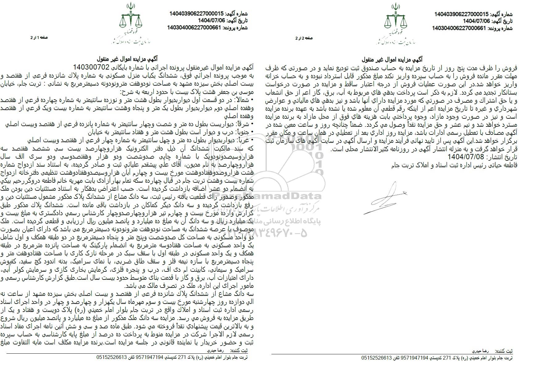 آگهی مزایده اموال غیر منقول پرونده اجرائی با شماره بایگانی 140300702