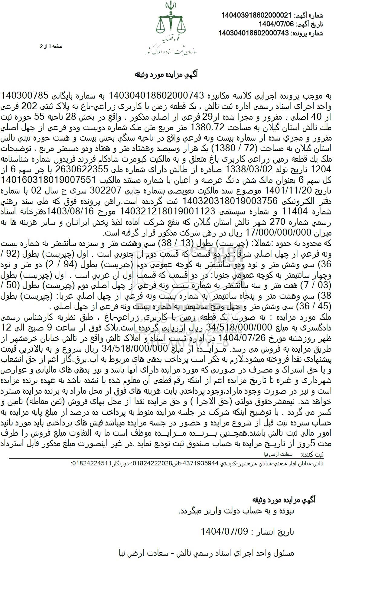 به موجب پرونده اجرایی کلاسه مکانیزه 140304018602000743 به شماره بایگانی 140300785 واحد اجرای اسناد رسمی اداره ثبت تالش، یک قطعه زمین با کاربری زراعی - باغ به پلاک ثبتی 202 فرعی از 40 اصلی ، مفروز و مجزا شده از 29 فرعی از اصلی مذکور ، واقع در بخش 28 ناحیه 55 حوزه ثبت ملک تالش استان گیلان به مساحت 1380.72 متر مربع متن ملک شماره دویست و دو فرعی از چهل اصلی مفروز و مجری شده از شماره بیست و نه فرعی واقع در ناحیه سنگی بخش بیست و هشت حوزه ثبتی تالش استان گیلان به مساحت 72 . 1380 یک هزار و سیصد و هشتاد متر و هفتاد و دو دسیمتر مربع ، توضیحات ملک یك قطعه زمین زراعی کاربری باغ متعلق و به مالکیت کیومرت شادکام فرزند فریدون شماره شناسنامه 1204 تاریخ تولد 1338.03.02 صادره از طالش دارای شماره ملی 2630622355 با جز سهم 6 از كل سهم 6 بعنوان مالک شش دانگ عرصه و اعیان با شماره مستند مالکیت 140160318019007551 تاریخ 1401.11.20 موضوع سند مالکیت تعویضی بشماره چاپی 302207 سری ج سال 02 با شماره دفتر الکترونیکی 140320318019003756 ثبت گردیده است. راهن پرونده فوق که طی سند رهنی شماره 11404 و شماره سیستمی 140321218019001123 مورخ 1403.08.16 دفترخانه اسناد رسمی شماره 270 شهر تالش استان گیلان که بنفع شرکت آماده لذیذ پخش ایرانیان و سایر هزینه ها به میزان 17.000.000.000 ریال در رهن شرکت مذکور قرار گرفته است.