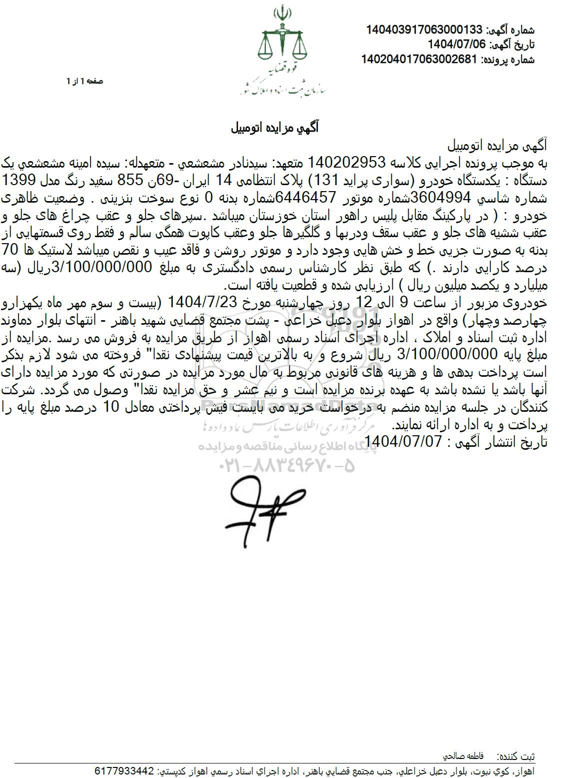 به موجب پرونده اجرایی کلاسه 140202953 متعهد سیدنا در مشعشعي - متعهدله سيده امینه مشعشعی یک دستگاه : یک دستگاه خودرو سواری پراید 131) پلاک انتظامی 14 ایران 69 - 855- سفید رنگ مدل 1399 شماره شاسي 3604994 شماره موتور 6446457 شماره بدنه 0 نوع سوخت بنزینی . وضعیت ظاهری خودرو : در پارکینگ مقابل پلیس راهور استان خوزستان میباشد سپرهای جلو و عقب چراغ های جلو و عقب ششیه های جلو و عقب سقف و دربها و گلگیرها جلو و عقب کاپوت همگی سالم و فقط روی قسمتهایی از بدنه به صورت جزیی خط و خش هایی وجود دارد و موتور روشن و فاقد عیب و نقص میباشد لاستیک ها 70 درصد کارایی دارند . که طبق نظر کارشناس رسمی دادگستری به مبلغ 3.100.000.000 ریال (سه میلیارد و یکصد میلیون ریال ) ارزیابی شده و قطعیت یافته است.