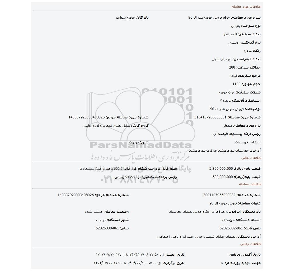 مزایده عمومی مزایده فروش خودرو تندر ال 90 برگزار میگردد. از کلیه افراد متخصص و شرکت‌های واجد شرایط دعوت به عمل می‌آید تا در این مزایده با کد خبرگزاری پارس نماد : 9612995 شرکت نمایند تاریخ شروع مزایده : 1404/07/06 مهلت شرکت در مزایده: تا پایان روز 1404/07/20 مکان برگزاری اموال واگذاری استان‌های خوزستان و دسته‌بندی‌های مربوط به این حراجی انواع خودرو سبک میباشد.