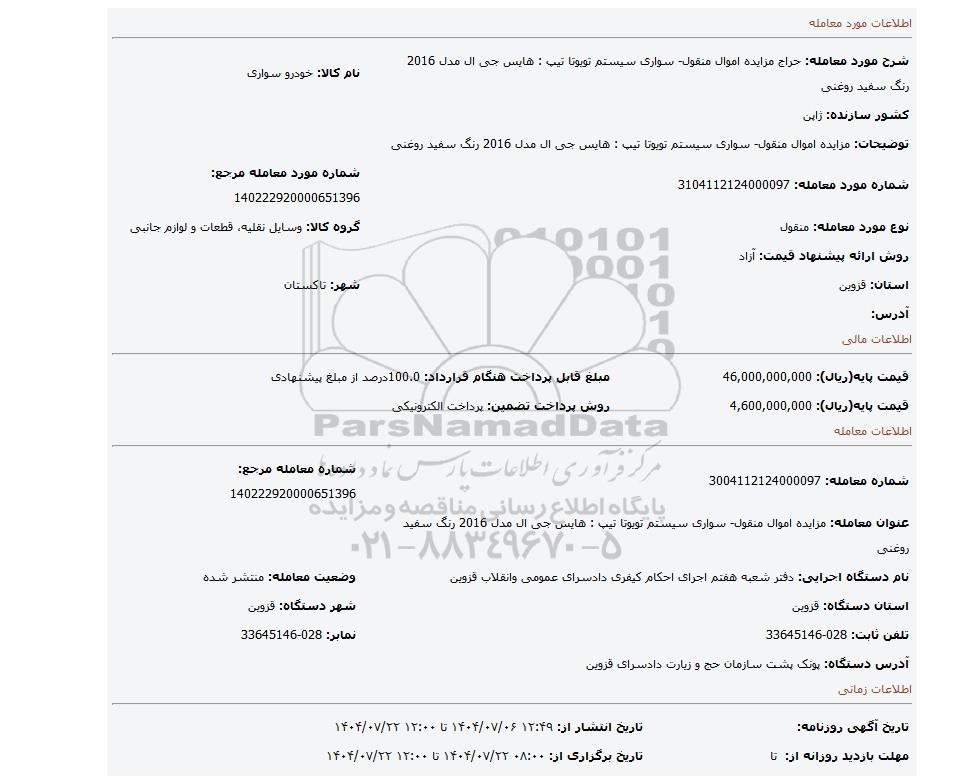 | شرح مورد معامله: حراج مزایده اموال منقول- سواری سیستم تویوتا تیپ : هایس جی ال مدل 2016 رنگ سفید روغنی | نام کالا: خودرو سواری | |