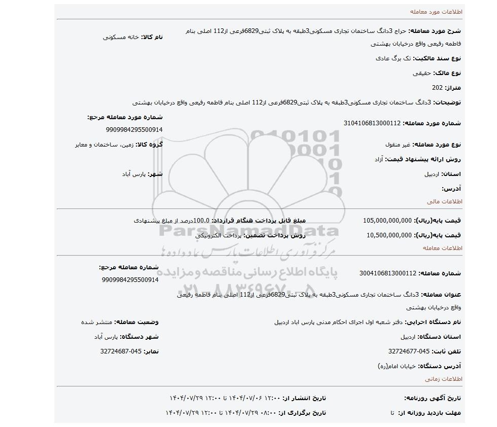 | شماره مورد معامله: 3104106813000112 | شماره مورد معامله مرجع: 9909984295500914 | |