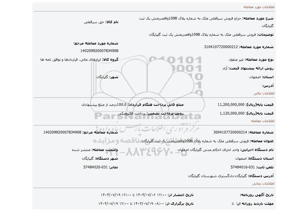 | شماره مورد معامله: 3104107720000212 | شماره مورد معامله مرجع: 140209920007834908 | |