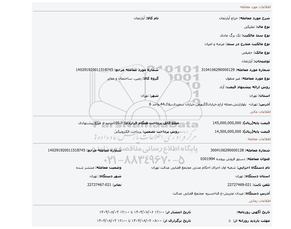 | شرح مورد معامله: حراج آپارتمان | نام کالا: آپارتمان | |