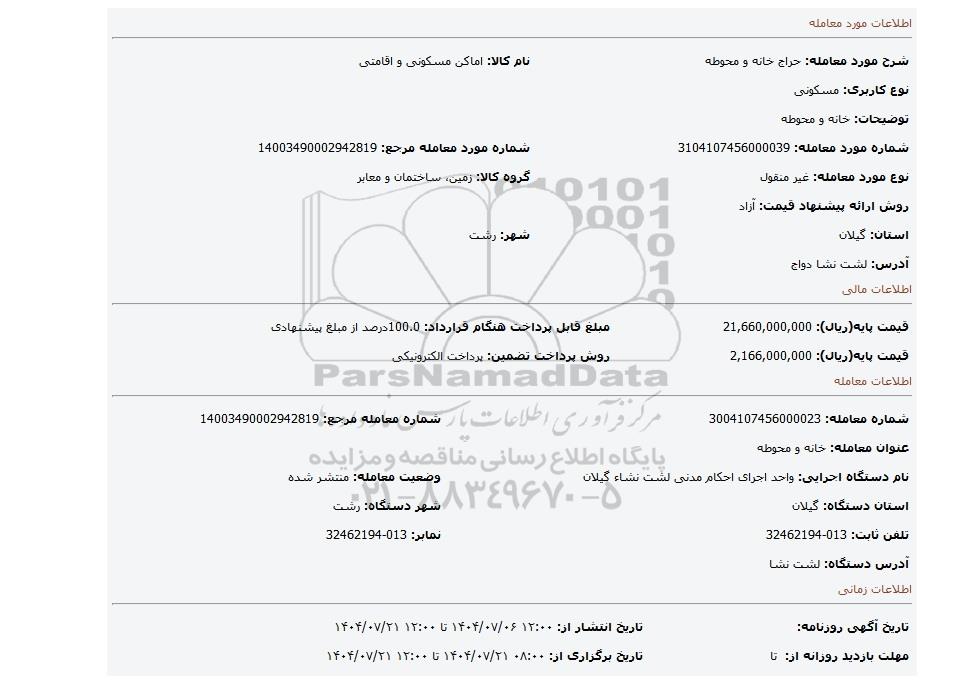 | نام دستگاه اجرایی: واحد اجرای احکام مدنی لشت نشاء گیلان | وضعیت معامله: منتشر شده | |