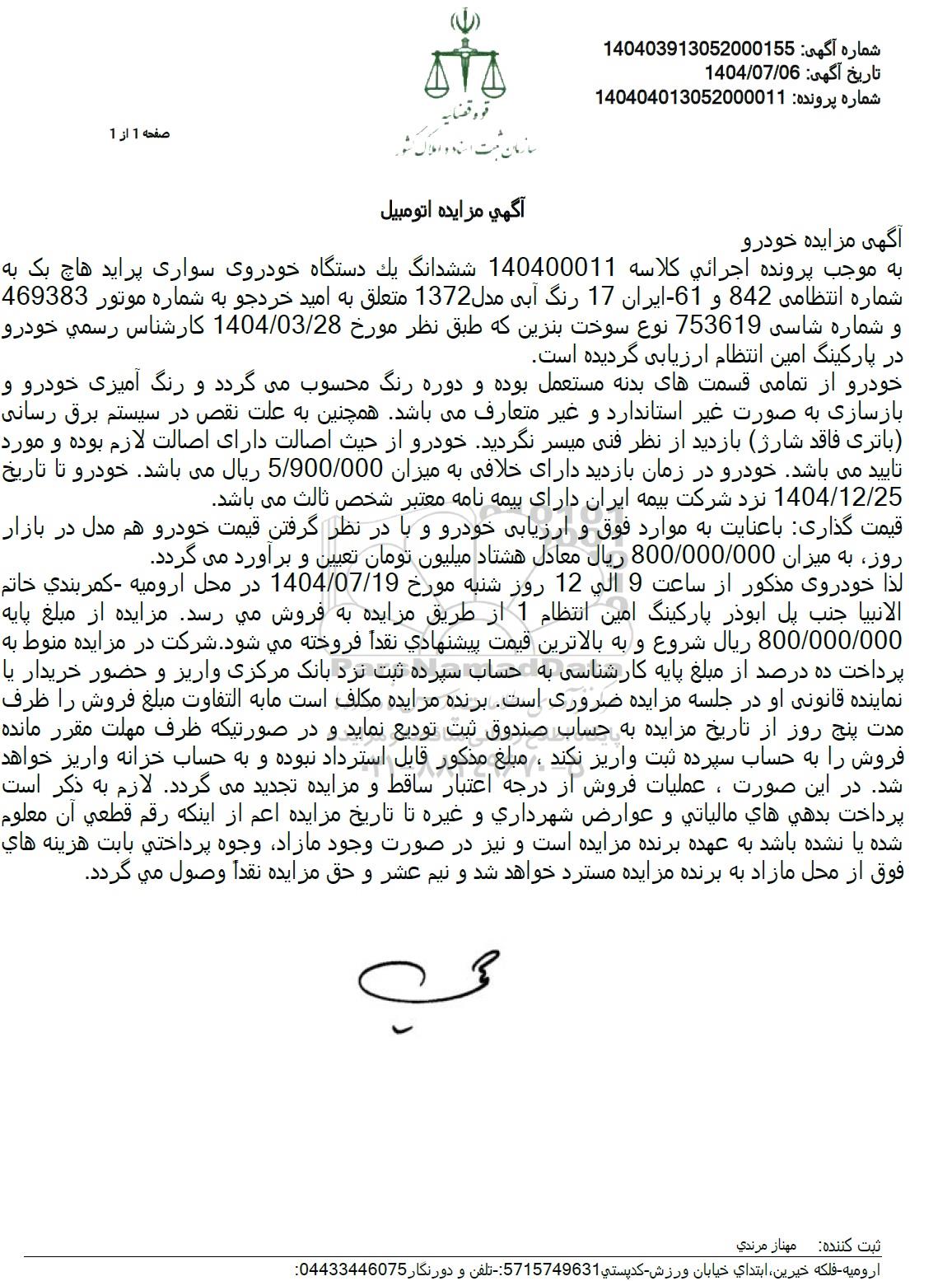 لذا خودروی مذکور از ساعت 9 الی 12 روز شنبه مورخ 1404.07.19 در محل ارومیه - كمربندی خاتم الانبیا جنب پل ابوذر پارکینگ امین انتظام 1 از طریق مزایده به فروش می رسد. مزایده از مبلغ پایه 800.000.000 ریال شروع و به بالاترین قیمت پیشنهادی نقدا فروخته می شود شرکت در مزایده منوط به پرداخت ده درصد از مبلغ پایه کارشناسی به حساب سپرده ثبت نزد بانک مرکزی واریز و حضور خریدار یا نماینده قانونی او در جلسه مزایده ضروری است برنده مزایده مکلف است مابه التفاوت مبلغ فروش را ظرف مدت پنج روز از تاریخ مزایده به حساب صندوق ثبت تودیع نماید و در صورتیکه ظرف مهلت مقرر مانده فروش را به حساب سپرده ثبت واریز نکند، مبلغ مذکور قابل استرداد نبوده و به حساب خزانه واریز خواهد شد. در این صورت، عملیات فروش از درجه اعتبار ساقط و مزایده تجدید میگردد. لازم به ذکر است پرداخت بدهی های مالیاتی و عوارض شهرداری و غیره تا تاریخ مزایده اعم از اینکه رقم قطعی آن معلوم شده یا نشده باشد به عهده برنده مزایده است و نیز در صورت وجود مازاد وجوه پرداختی بابت هزینه های فوق از محل مازاد به برنده مزایده مسترد خواهد شد و نیم عشر و حق مزایده نقداً وصول می گردد.