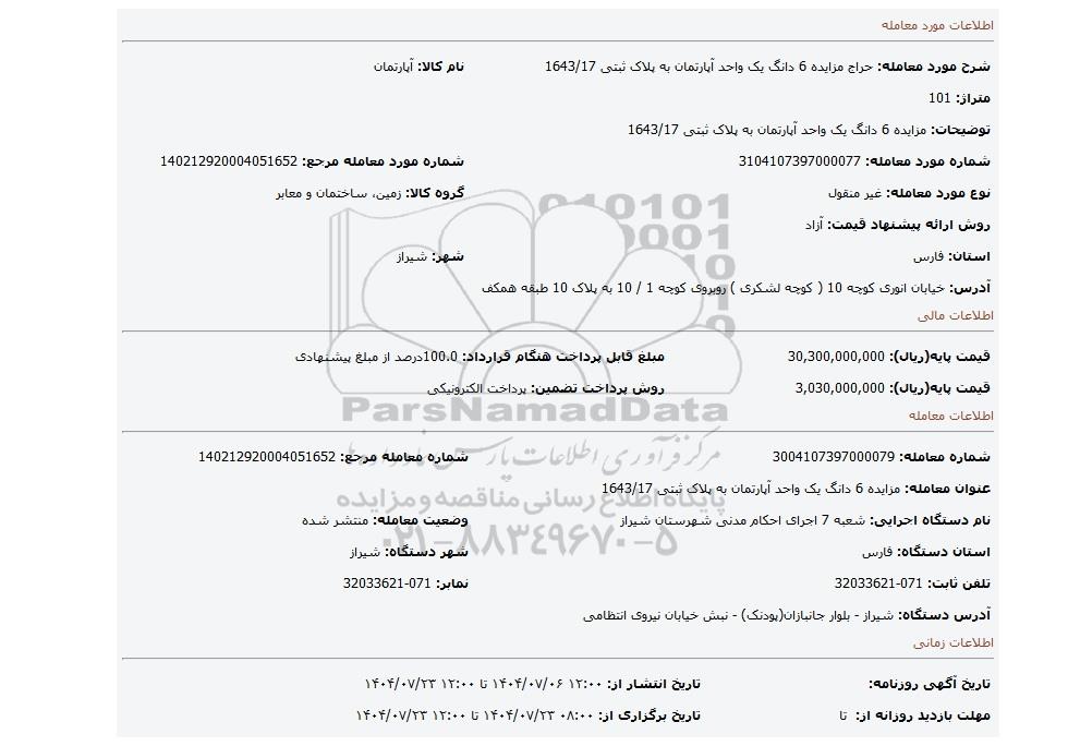 | شرح مورد معامله: حراج مزایده 6 دانگ یک واحد آپارتمان به پلاک ثبتی 1643/17 | نام کالا: آپارتمان | |