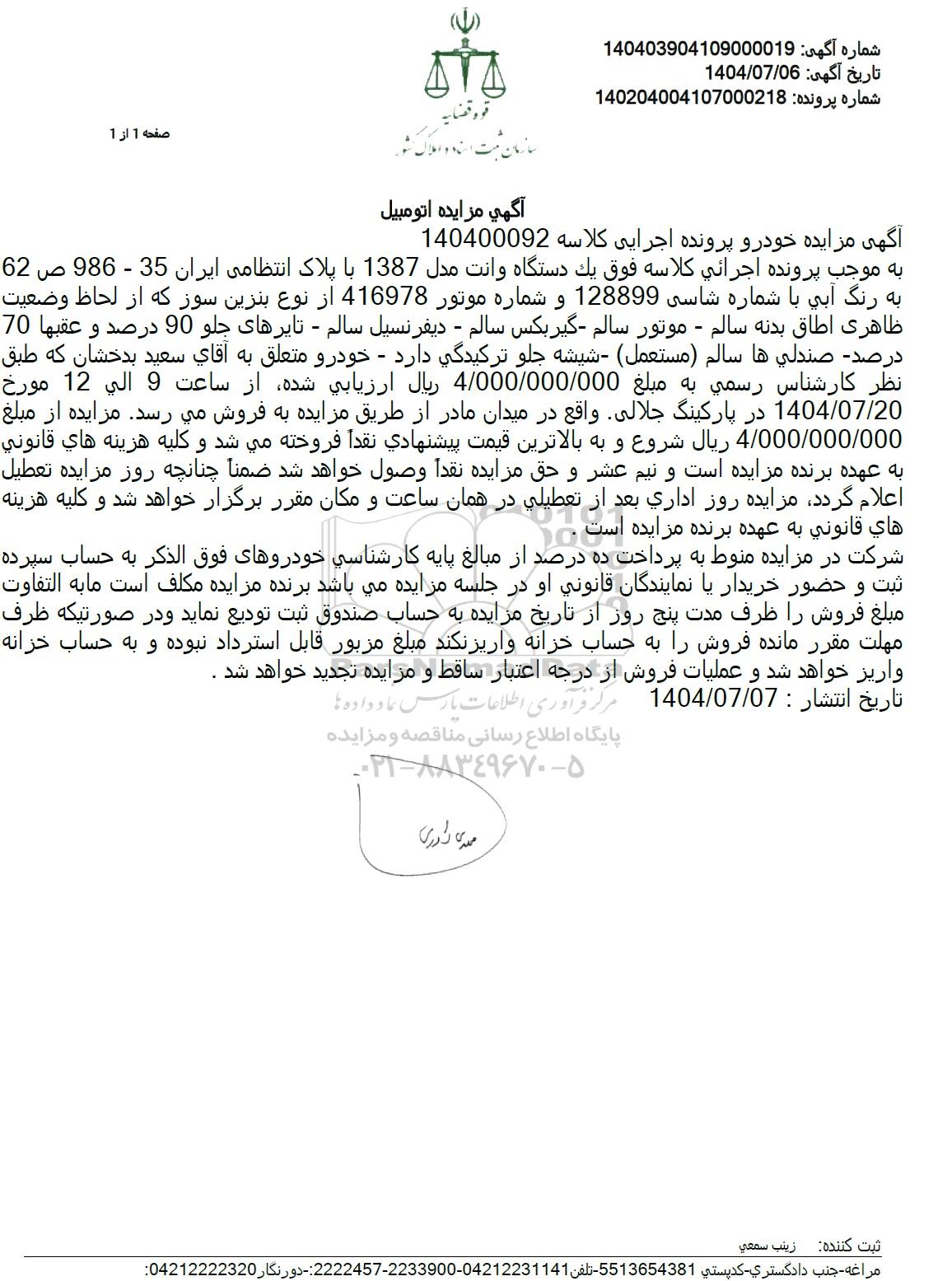 به موجب پرونده اجرائی کلاسه فوق یک دستگاه وانت مدل 1387 با پلاک انتظامی ایران 35 - 986 ص 62 به رنگ آبی با شماره شاسی 128899 و شماره موتور 416978 از نوع بنزین سوز که از لحاظ وضعیت ظاهری اطاق بدنه سالم - موتور سالم گیربکس سالم - دیفرنسیل سالم - تایرهای جلو 90 درصد و عقبها 70 درصد صندلی ها سالم (مستعمل) شیشه جلو ترکیدگی دارد - خودرو متعلق به آقای سعید بدخشان که طبق نظر کارشناس رسمی به مبلغ 4.000.000.000 ریال ارزیابی شده از ساعت 9 الی 12 مورخ 1404.07.20 در پارکینگ جلالی واقع در میدان مادر از طریق مزایده به فروش می رسد. مزایده از مبلغ 4.000.000.000 ریال شروع و به بالاترین قیمت پیشنهادی نقداً فروخته می شد و کلیه هزینه های قانونی به عهده برنده مزایده است و نیم عشر و حق مزایده نقداً وصول خواهد شد ضمنا چنانچه روز مزایده تعطیل اعلام گردد مزایده روز اداری بعد از تعطیلی در همان ساعت و مکان مقرر برگزار خواهد شد و کلیه هزینه های قانونی به عهده برنده مزایده است.