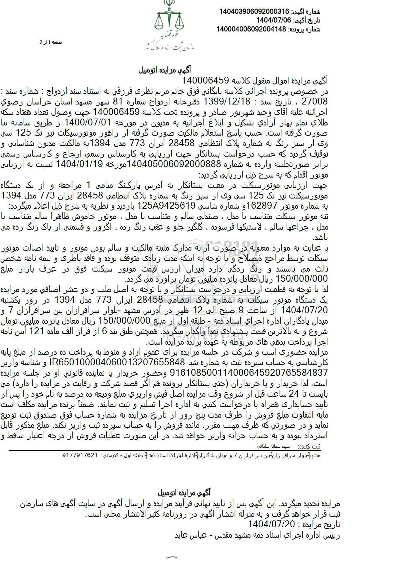 لذا با توجه به قطعیت ارزیابی و درخواست بستانکار و با توجه به اصل طلب و دو عشر اضافی مورد مزایده یک دستگاه موتور سیکلت به شماره پلاک انتظامی 28458 ایران 773 مدل 1394 در روز یکشنبه 1404.07.20 از ساعت 9 صبح الی 12 ظهر در آدرس مشهد بلوار سرافرازان بین سرافرازان 7 و میدان یادگاران اداره اجرای اسناد ذمه - طبقه اول از مبلغ 150.000.000 ریال معادل پانزده میلیون تومان شروع و به بالاترین قیمت پیشنهادی نقدا واگذار میگردد همچنین طبق بند 6 از فراز الف ماده 121 آیین نامه اجرا پرداخت بدهی های مربوطه به عهده برنده مزایده است.