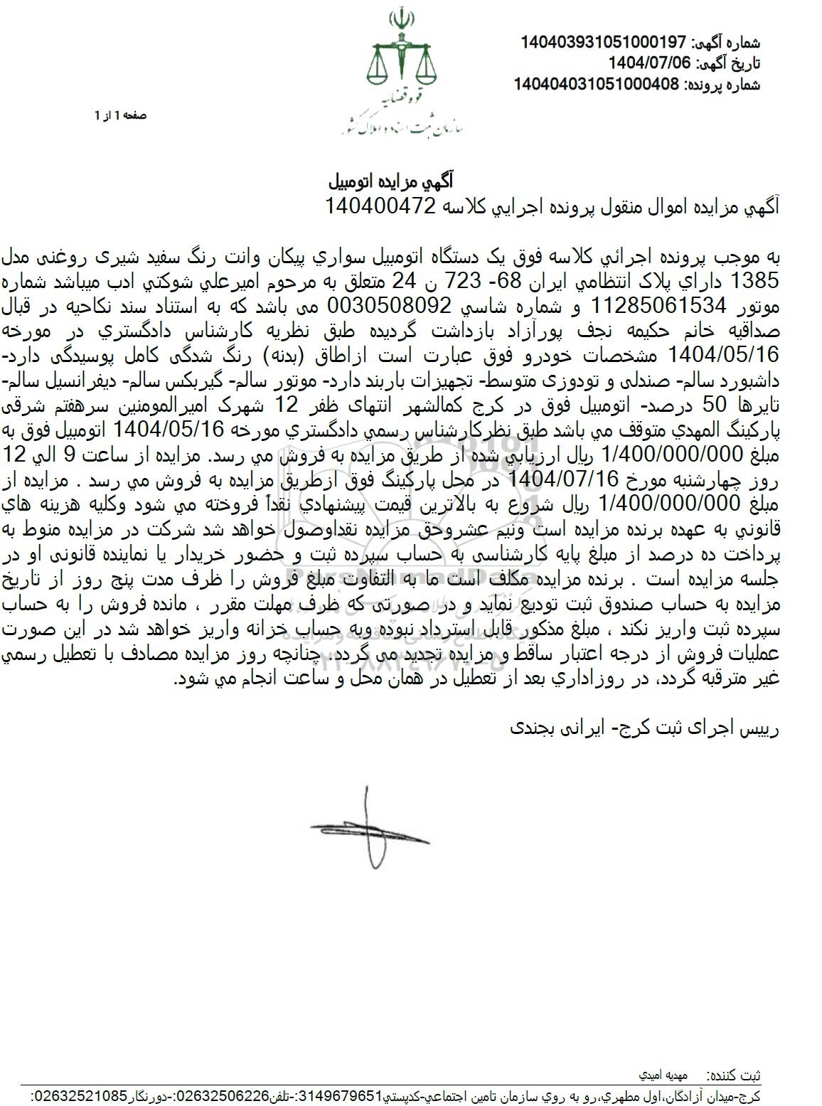به موجب پرونده اجرائی کلاسه فوق یک دستگاه اتومبیل سواری پیکان وانت رنگ سفید شیری روغنی مدل 1385 دارای پلاک انتظامی ایران - 723 ن 24 متعلق به مرحوم امیر علی شوكتی ادب میباشد شماره موتور 11285061534 و شماره شاسی 0030508092 می باشد که به استناد سند نکاحیه در قبال صداقیه خانم حکیمه نجف پورآزاد بازداشت گردیده طبق نظریه کارشناس دادگستری در مورخه 1404.05.16 مشخصات خودرو فوق عبارت است از اطاق (بدنه) رنگ شدگی کامل پوسیدگی دارد داشبورد سالم صندلی و تودوزی متوسط تجهیزات باربند دارد موتور سالم گیربکس سالم - دیفرانسیل سالم تایرها 50 درصد اتومبیل فوق در کرج کمالشهر انتهای ظفر 12 شهرک امیر المومنین سر هفتم شرقی پارکینگ المهدی متوقف می باشد طبق نظر کارشناس رسمی دادگستری مورخه 1404.05.16 اتومبیل فوق به مبلغ 1.400.000.000 ریال ارزیابی شده از طریق مزایده به فروش میرسد مزایده از ساعت 9 الی 12 روز چهارشنبه مورخ 1404.07.16 در محل پارکینگ فوق از طریق مزایده به فروش می رسد . مزایده از مبلغ 1.400.000.000 ریال شروع به بالاترین قیمت پیشنهادی نقدا فروخته می شود و كلیه هزینه های قانونی به عهده برنده مزایده است و نیم عشر و حق مزایده نقد ا وصول خواهد شد شرکت در مزایده منوط به پرداخت ده درصد از مبلغ پایه کارشناسی به حساب سپرده ثبت و حضور خریدار یا نماینده قانونی او در جلسه مزایده است. برنده مزایده مکلف است ما به التفاوت مبلغ فروش را ظرف مدت پنج روز از تاریخ مزایده به حساب صندوق ثبت تودیع نماید و در صورتی که ظرف مهلت مقرر ، مانده فروش را به حساب سپرده ثبت واریز نکند، مبلغ مذکور قابل استرداد نبوده و به حساب خزانه واریز خواهد شد در این صورت عملیات فروش از درجه اعتبار ساقط و مزایده تجدید میگردد چنانچه روز مزایده مصادف با تعطیل رسمی غیر مترقبه ،گردد در روز اداری بعد از تعطیل در همان محل و ساعت انجام می شود.