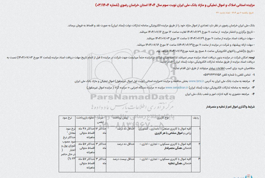 مزایده استانی املاک و اموال تملیکی و مازاد بانک ملی ایران نوبت سوم سال 1404 استان خراسان رضوی (شماره 03.1404) ؟