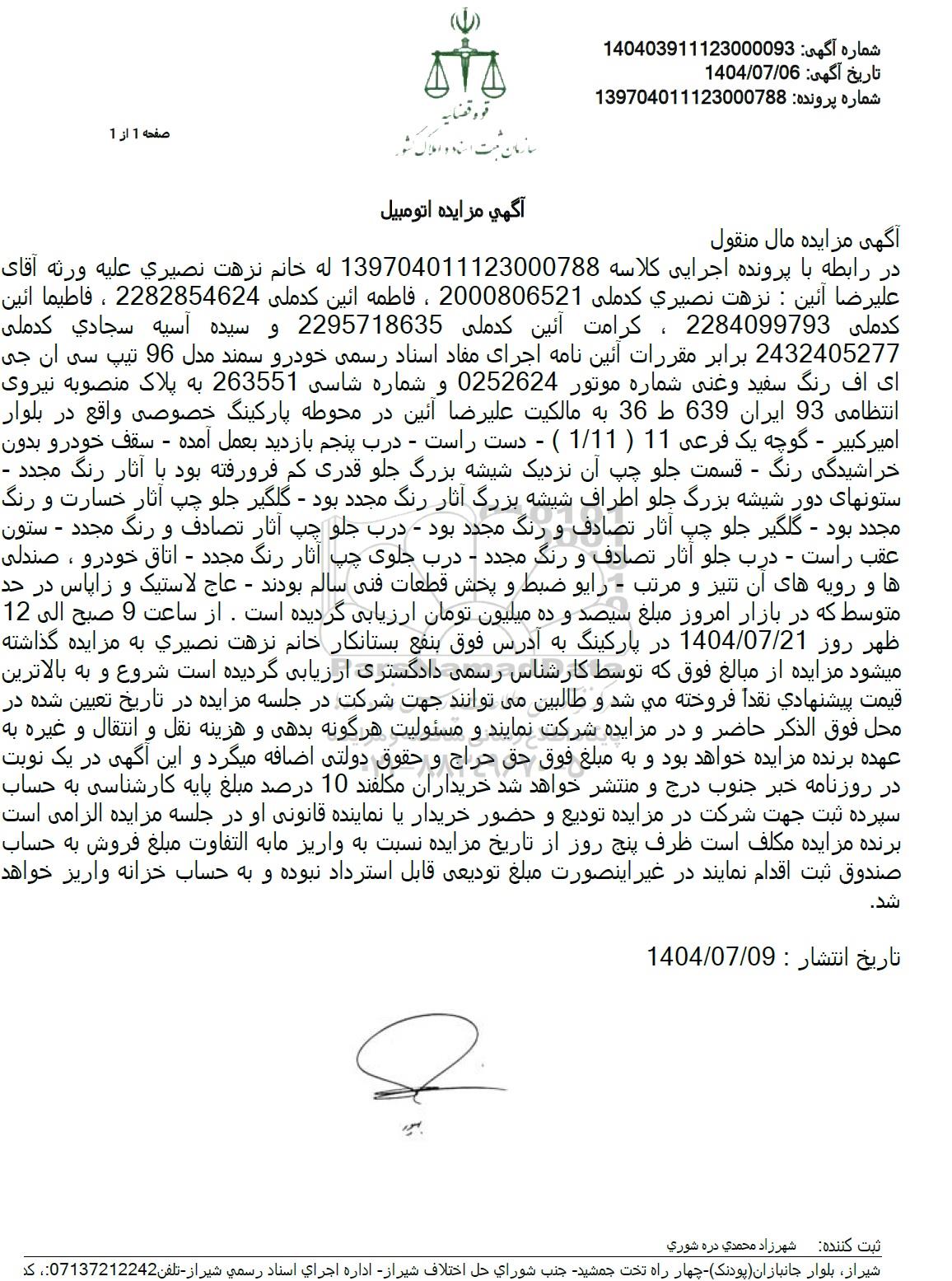 در رابطه با پرونده اجرایی کلاسه 139704011123000788 له خانم نزهت نصیری علیه ورثه آقای علیرضا آئین : نزهت رهت نصیری کدملی 2000806521 ، فاطمه ائین کدملی 2282854624 ، فاطیما ائین کدملی 2284099793 ، کرامت آئین کدملی 2295718635 و سیده آسیه سجادی کدملی 2432405277 برابر مقررات آئین نامه اجرای مفاد اسناد رسمی خودرو سمند مدل 96 تیپ سی ان جی ای اف رنگ سفید و غنی شماره موتور 0252624 و شماره شاسی 263551 به پلاک منصوبه نیروی انتظامی 93 ایران 639 ط 36 به مالکیت علیرضا آئین در محوطه پارکینگ خصوصی واقع در بلوار امیر کبیر - گوچه یک فرعی 11 ( 1/11 ) - دست راست - درب پنجم بازدید بعمل آمده - سقف خودرو بدون خراشیدگی رنگ - قسمت جلو چپ آن نزدیک شیشه بزرگ جلو قدری کم فرو رفته بود با آثار رنگ مجدد -ستونهای دور شیشه بزرگ جلو اطراف شیشه بزرگ آثار رنگ مجدد بود - گلگیر جلو چپ آثار خسارت و رنگ مجدد بود - گلگیر جلو چپ آثار تصادف و رنگ مجدد بود - درب جلو چپ آثار تصادف و رنگ مجدد - ستون عقب راست - درب جلو آثار تصادف و رنگ مجدد - درب جلوی چپ آثار رنگ مجدد - اتاق خودرو ، صندلی ها و رویه های آن تمیز و مرتب - رایو ضبط و پخش قطعات فنی سالم بودند - عاج لاستیک و زاپاس در حد متوسط که در بازار امروز مبلغ سیصد و ده میلیون تومان ارزیابی گردیده است. از ساعت 9 صبح الى 12 ظهر روز 1404.07.21 در پارکینگ به آدرس فوق بنفع بستانکار خانم نزهت نصیری به مزایده گذاشته می شود مزایده از مبالغ فوق که توسط کارشناس رسمی دادگستری ارزیابی گردیده است شروع و به بالاترین قیمت پیشنهادی نقدا فروخته می شد و طالبین می توانند جهت شرکت در جلسه مزایده در تاریخ تعیین شده در محل فوق الذکر حاضر و در مزایده شرکت نمایند و مسئولیت هرگونه بدهی و هزینه نقل و انتقال و غیره به عهده برنده مزایده خواهد بود و به مبلغ فوق حق حراج و حقوق دولتی اضافه میگرد و این آگهی در یک نوبت در روزنامه خبر جنوب درج و منتشر خواهد شد خریداران مکلفند 10 درصد مبلغ پایه کارشناسی به حساب سپرده ثبت جهت شرکت در مزایده تودیع و حضور خریدار با نماینده قانونی او در جلسه مزایده الزامی است. برنده مزایده مکلف است ظرف پنج روز از تاریخ مزایده نسبت به واریز ما به التفاوت مبلغ فروش به حساب صندوق ثبت اقدام نمایند در غیر اینصورت مبلغ تودیعی قابل استرداد نبوده و به حساب خزانه واریز خواهد شد.
