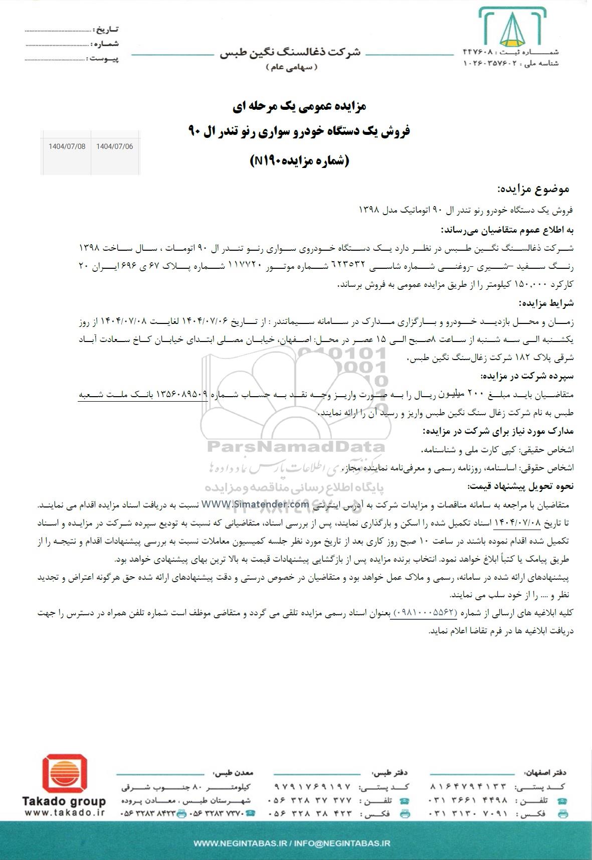 شرکت ذغالسنگ نگین طبس در نظر دارد یک دستگاه خودروی سواری رنو تندر ال 90 اتومات، سال ساخت 1398 رنگ سفید شیری روغنی شماره شاسی 623532 شماره موتور 117720 شماره پلاک 67 ی 696 ایران 20 کارکرد 150.000 کیلومتر را از طریق مزایده عمومی به فروش برساند.