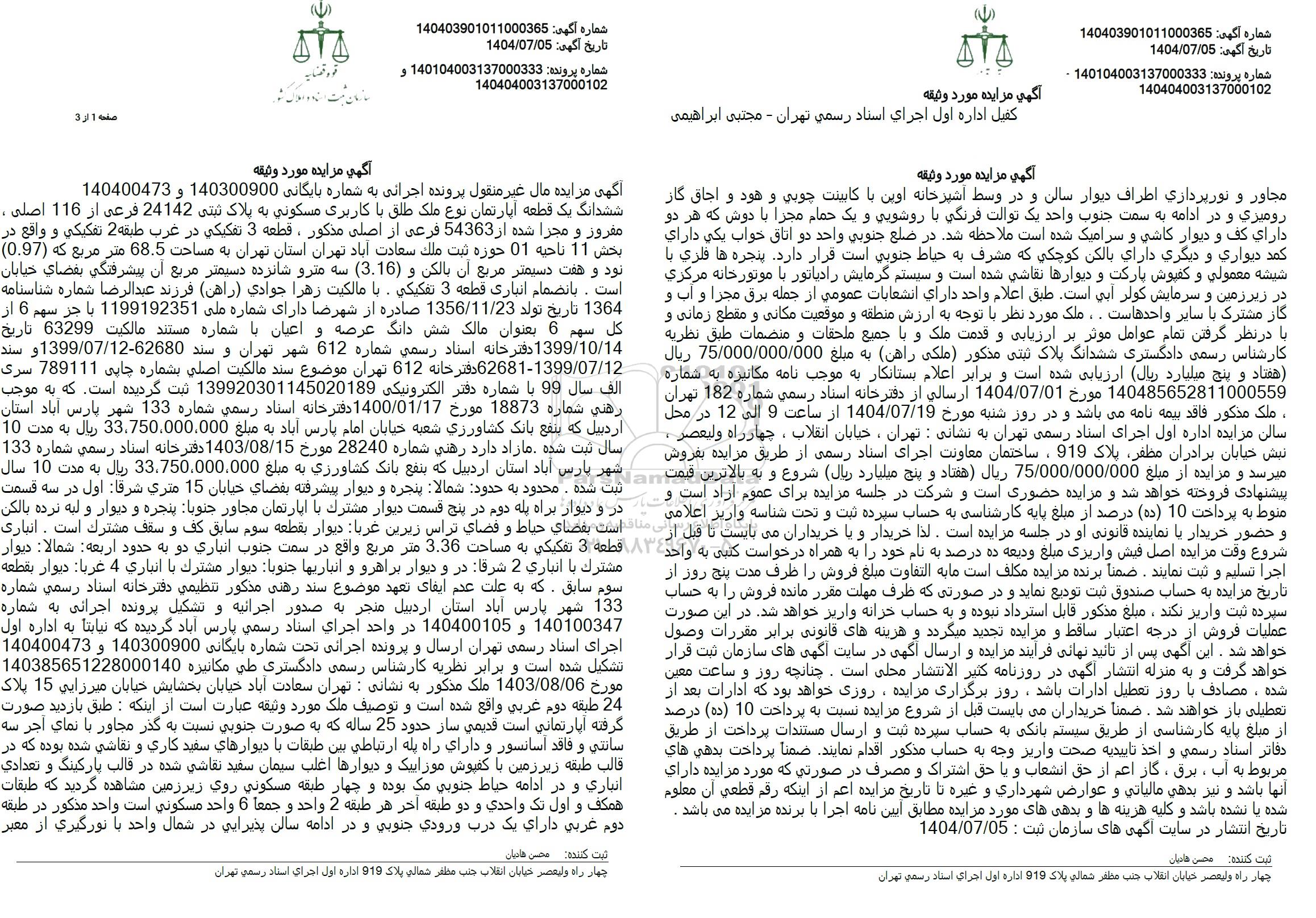 ششدانگ یک قطعه آپارتمان نوع ملک طلق با کاربری مسکونی به پلاک ثبتی 24142 فرعی از 116 اصلی ، مفروز و مجرا شده از 54363 فرعی از اصلی مذکور، قطعه 3 تفکیکی در غرب طبقه 2 تفکیکی و واقع در بخش 11 ناحیه 01 حوزه ثبت ملك سعادت آباد تهران استان تهران به مساحت 68.5 متر مربع که (0.97) بود و هفت دسیمتر مربع آن بالکن و (3.16) سه مترو شانزده دستمتر مربع آن پیشرفتگی بفضای خیابان است. بانضمام انباری قطعه 3 تفكيكي - با مالکیت زهرا جوادی راهن) فرزند عبد الرضا شماره شناسنامه 1364 تاریخ تولد 1356.11.23 صادره از شهرضا دارای شماره ملی 1199192351 با جز سهم 6 از كل سهم 6 بعنوان مالک شش دانگ عرصه و اعیان با شماره مستند مالکیت 63299 تاريخ 1399.10.14 دفترخانه اسناد رسمی شماره 612 شهر تهران و سند 62680-1399.07.12 و سند 62681-1399.07.12 دفترخانه 612 تهران موضوع سند مالکیت اصلی بشماره چایی 789111 سری الف سال 99 با شماره دفتر الکترونیکی 139920301145020189 ثبت گردیده است. که به موجب رهني شماره 18873 مورخ 1400.01.17 دفترخانه اسناد رسمی شماره 133 شهر پارس آباد استان اردبیل که بنفع بانک کشاورزی شعبه خیابان امام پارس آباد به مبلغ 33.750.000.000 ریال به مدت 10 سال ثبت شده مازاد دارد رهنی شماره 28240 مورخ 1403.08.15 دفترخانه اسناد رسمی شماره 133 شهر پارس آباد استان اردبیل که بنفع بانک کشاورزی به مبلغ 33.750.000.000 ریال به مدت 10 سال ثبت شده محدود به حدود شمالا پنجره و دیوار پیشرفته بفضای خیابان 15 متری شرقا اول در سه قسمت در و دیوار براه پله دوم در پنج قسمت دیوار مشترک با اپارتمان مجاور جنوبا پنجره و دیوار و لبه نرده بالکن است بفضای حیاط و فضای تراس زیرین غربا ديوار بقطعه سوم سابق کف و سقف مشترک است. انباری قطعه 3 تفكيكي به مساحت 3.36 متر مربع واقع در سمت جنوب انباری دو به حدود اربعه شمالا دیوار مشترك با انباری 2 شرقا در و دیوار براهرو و انباریها جنوبا دیوار مشترك با انباري 4 عربا: ديوار بقطعه سوم سابق که به علت عدم ایفای تعهد موضوع سند رهنی مذکور تنظیمی دفترخانه اسناد رسمی شماره 133 شهر پارس آباد استان اردبیل منجر به صدور اجرائیه و تشکیل پرونده اجرائی به شماره 140100347 و 140400105 در واحد اجرای اسناد رسمی پارس آباد گردیده که نیابتا به اداره اول اجرای اسناد رسمی تهران ارسال و پرونده اجرائی تحت شماره بایگانی 140300900 و 140400473 تشکیل شده است و برابر نظریه کارشناس رسمی دادگستری طي مكاثيره 140385651228000140 مورخ 1403.08.06 ملک مذکور به نشانی : تهران سعادت آباد خیابان بخشایش خیابان میرزایی 15 پلاک 24 طبقه دوم غربی واقع شده است و توصیف ملک مورد وثیقه عبارت است از اینکه : طبق بازدید صورت گرفته آپارتمانی است قدیمی ساز حدود 25 ساله که به صورت جنوبی نسبت به گذر مجاور با نمای آجر سه سانتی و فاقد آسانسور و داراي راه پله ارتباطی بین طبقات با دیوارهای سفید کاری و نقاشی شده بوده که در قالب طبقه زیرزمین با کفپوش موزاییک و دیوارها اغلب سیمان سفید نقاشی شده در قالب پارکینگ و تعدادی انباری و در ادامه حیاط جنوبی مک بوده و چهار طبقه مسکونی روی زیر زمین مشاهده گردید که طبقات همکف و اول تک واحدی و دو طبقه آخر هر طبقه 2 واحد و جمعاً 6 واحد مسکونی است واحد مذکور در طبقه دوم عربی دارای یک درب ورودی جنوبی و در ادامه سالن پذیرایی در شمال واحد با نورگیری از معبر مجاور و نورپردازی اطراف دیوار سالن و در وسط آشپرخانه اوین با کابینت چوبی و هود و اجاق گاز رومیزی و در ادامه به سمت جنوب واحد یک توالت فرنگی با روشویی و یک حمام مجزا با دوش که هر دو دارای کف و دیوار کاشی و سرامیک شده است ملاحظه شد. در ضلع جنوبی واحد دو اتاق خواب یکی دارای کمد دیواری و دیگری دارای بالکن کوچکی که مشرف به حیاط جنوبی است قرار دارد. پنجره ها فلزی با شیشه معمولی و کفپوش پارکت و دیوارها نقاشی شده است و سیستم گرمایش رادیاتور با موتورخانه مرکزی در زیر زمین و سرمایش کولر آبی است. طبق اعلام واحد دارای انشعابات عمومی از جمله برق مجرا و آب و گار مشترک با سایر واحدهاست. ملک مورد نظر با توجه به ارزش منطقه و موقعیت مکانی و مقطع زمانی و با د