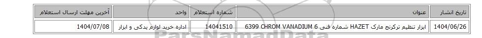 1404/06/26ابزار ‎تنظیم ترکرنج‏ مارک HAZET‎ شماره فنی ‎6399 CHROM VANADIUM 614041510اداره خرید لوازم یدکی و ابزار1404/07/08