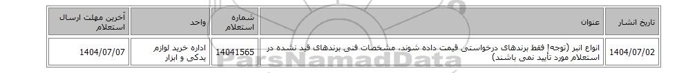 | 1404/07/02 | انواع انبر (توجه! فقط برندهای درخواستی قیمت داده شوند، مشخصات فنی برندهای قید نشده در استعلام مورد تأیید نمی باشند) | 14041565 | اداره خرید لوازم یدکی و ابزار | 1404/07/07 |