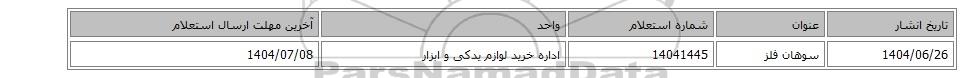 | 1404/06/26 | سوهان فلز | 14041445 | اداره خرید لوازم یدکی و ابزار | 1404/07/08 |