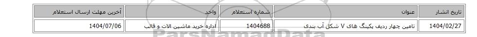 1404/02/27تامین چهار ردیف پکینگ های ‎V شکل‏ ‎آب بندی ‏1404688اداره خرید ماشین الات و قالب1404/07/06