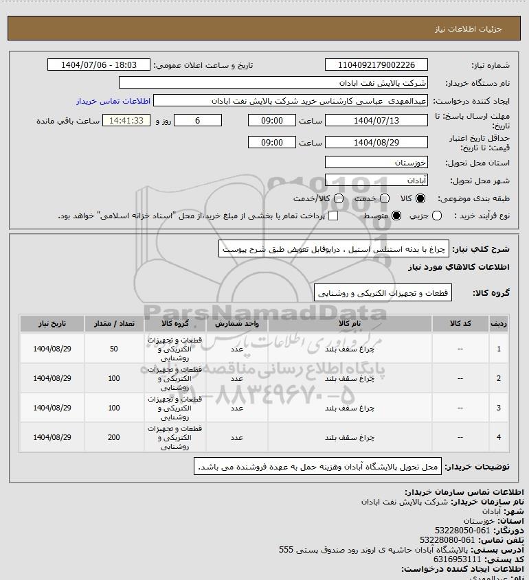 استعلام چراغ با بدنه استنلس استیل درایوقابل تعویض طبق شرح پیوست, استعلام چراغ با بدنه استنلس استیل ، درایوقابل تعویض طبق شرح پیوست