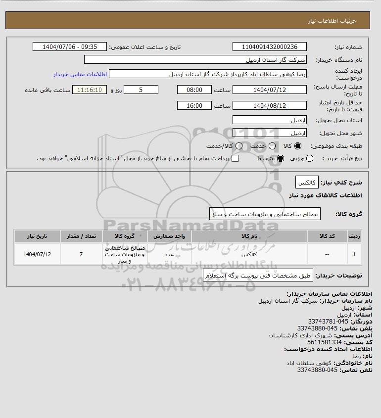 | 1 | -- | کانکس | عدد | مصالح ساختمانی و ملزومات ساخت و ساز | 7 | 1404/07/12 |