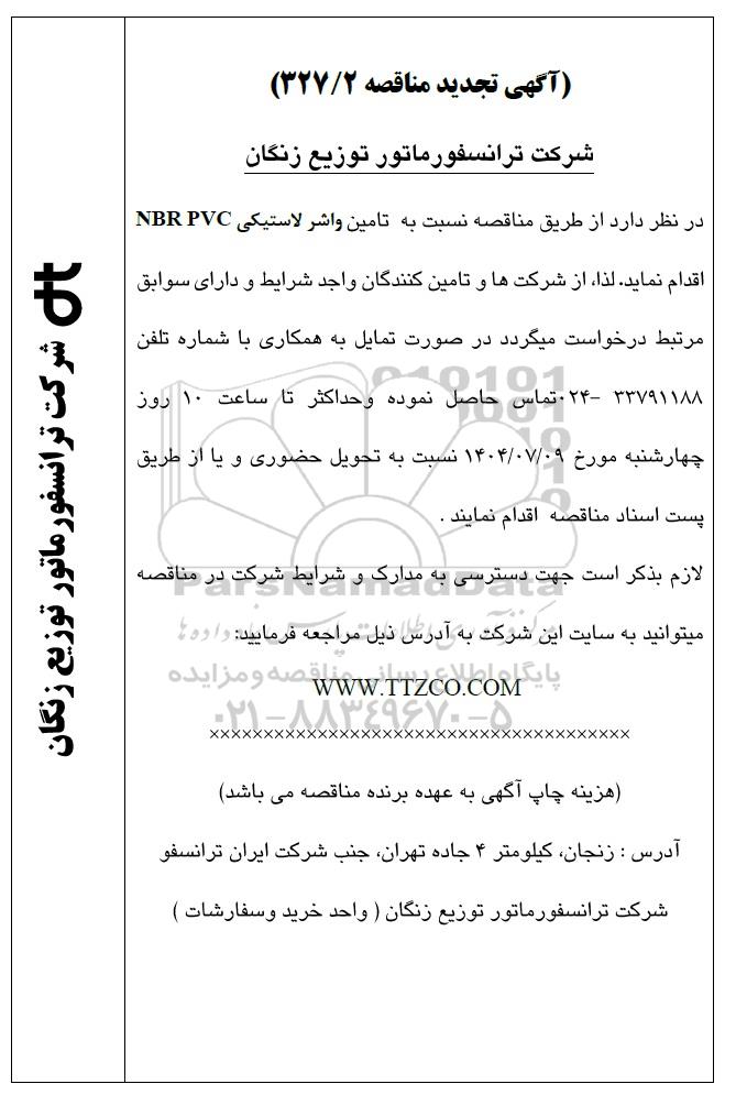 در نظر دارد از طریق مناقصه نسبت به تامین واشر لاستیکی NBR PVC اقدام نماید. لذا از، شرکت ها و تأمین کنندگان واجد شرایط و دارای سوابق مرتبط درخواست می گردد در صورت تمایل به همکاری با شماره تلفن 33791188 - 024 تماس حاصل نموده و حداکثر تا ساعت 10 روز چهارشنبه مورخ 1404.07.09 نسبت به تحویل حضوری و یا از طریق پست اسناد مناقصه اقدام نمایند.