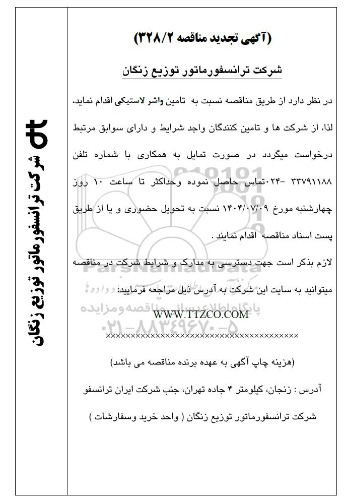 در نظر دارد از طریق مناقصه نسبت به تامین واشر لاستیکی اقدام نماید. لذا از، شرکت ها و تأمین کنندگان واجد شرایط و دارای سوابق مرتبط درخواست می گردد در صورت تمایل به همکاری با شماره تلفن 33791188 - 024 تماس حاصل نموده و حداکثر تا ساعت 10 روز چهارشنبه مورخ 1404.07.09 نسبت به تحویل حضوری و یا از طریق پست اسناد مناقصه اقدام نمایند.