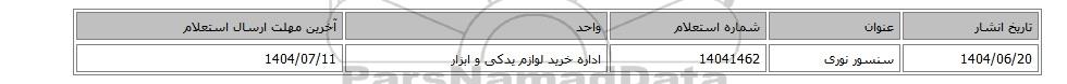 | 1404/06/20 | سنسور نوری | 14041462 | اداره خرید لوازم یدکی و ابزار | 1404/07/11 |