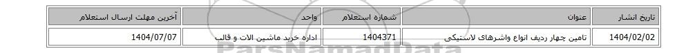 1404/02/02تامین چهار ردیف انواع واشرهای لاستیکی‏1404371اداره خرید ماشین الات و قالب1404/07/07