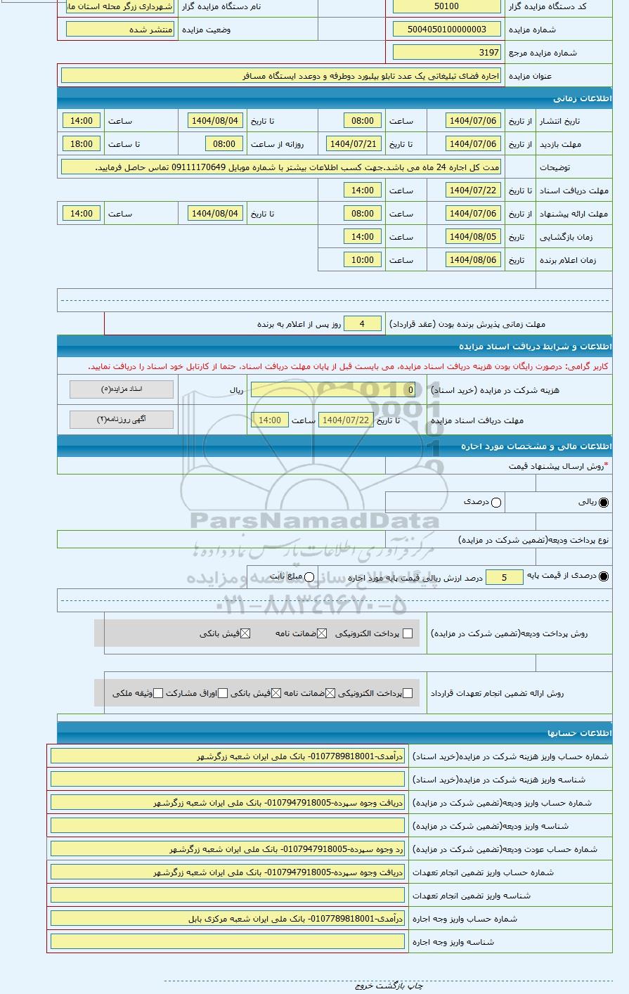 | شماره مزایده | 5004050100000003 | |||