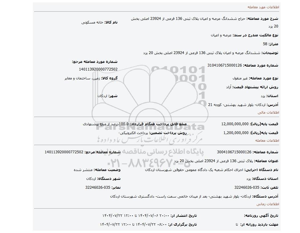 | عنوان معامله: پلاک ثبتی 136 فرعی از 23924 اصلی بخش 20 یزد | ||