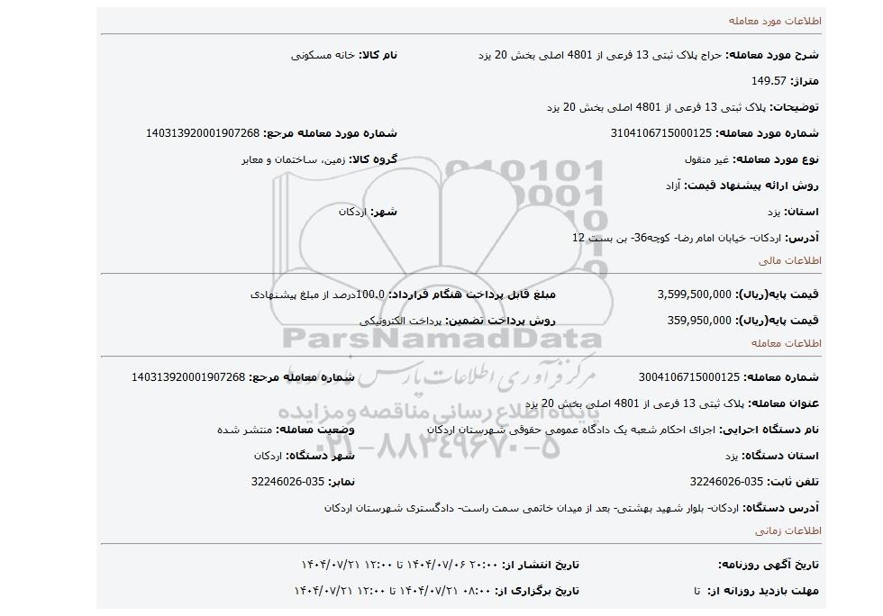مزایده عمومی مزایده پلاک ثبتی 13 فرعی از 4801 اصلی بخش 20 یزد برگزار میگردد. از کلیه افراد متخصص و شرکتهای واجد شرایط دعوت به عمل میآید تا در این مزایده با کد خبرگزاری پارس نماد : 9614682 شرکت نمایند تاریخ شروع مزایده : 1404/07/06 مهلت شرکت در مزایده: تا پایان روز 1404/07/21