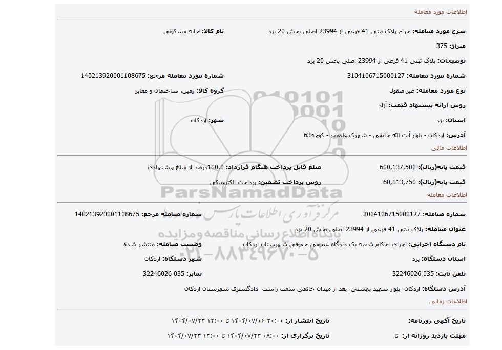| عنوان معامله: پلاک ثبتی 41 فرعی از 23994 اصلی بخش 20 یزد | ||