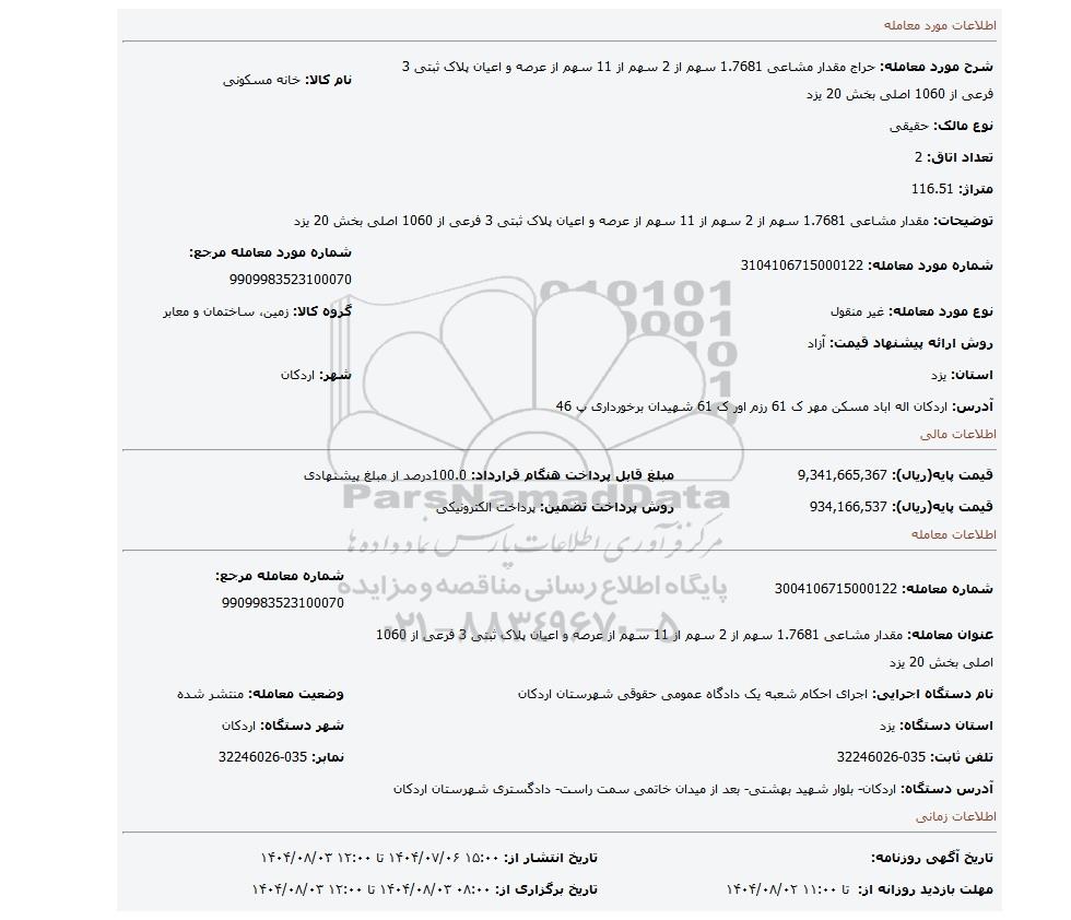 | شرح مورد معامله: حراج مقدار مشاعی 1.7681 سهم از 2 سهم از 11 سهم از عرصه و اعیان پلاک ثبتی 3 فرعی از 1060 اصلی بخش 20 یزد | نام کالا: خانه مسکونی | |