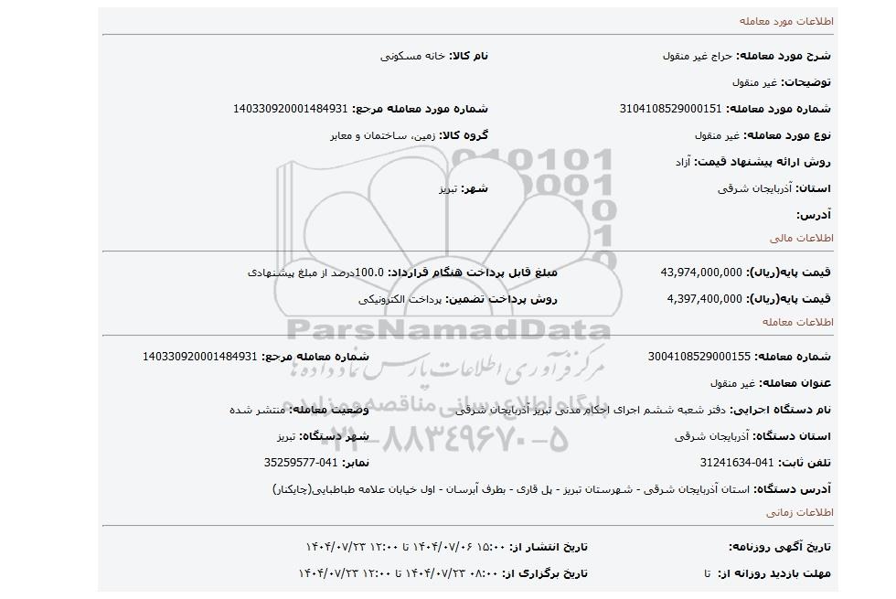 | نام دستگاه اجرایی: دفتر شعبه ششم اجرای احکام مدنی تبریز آذربایجان شرقی | وضعیت معامله: منتشر شده | |